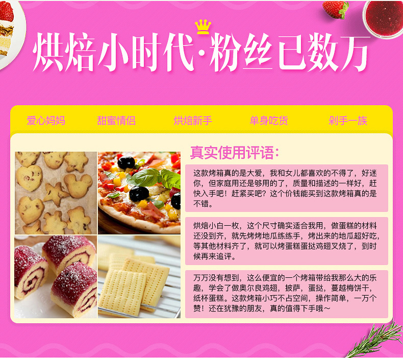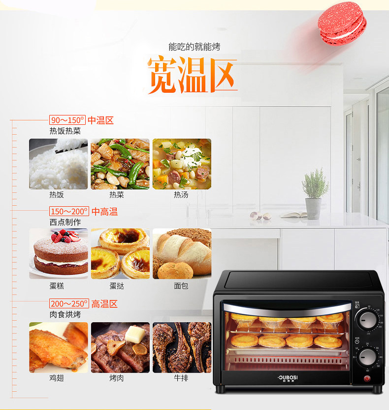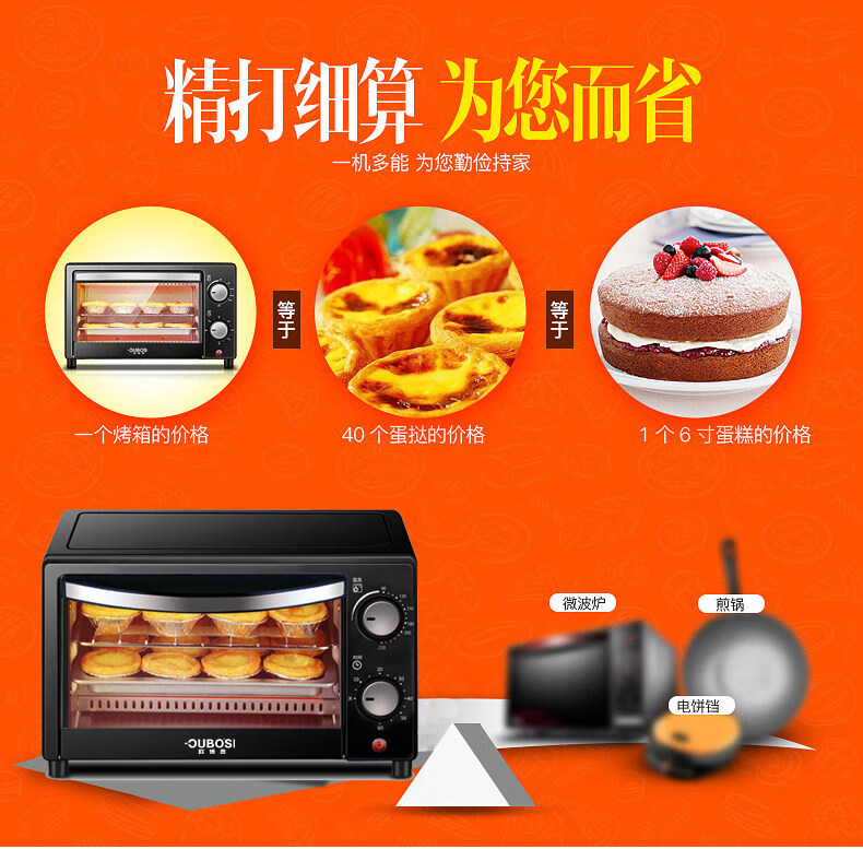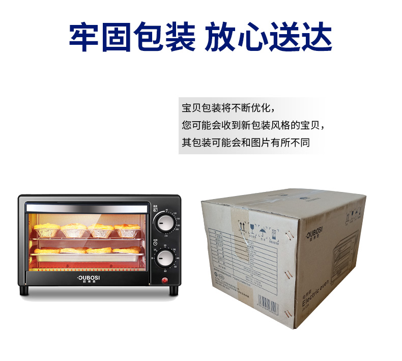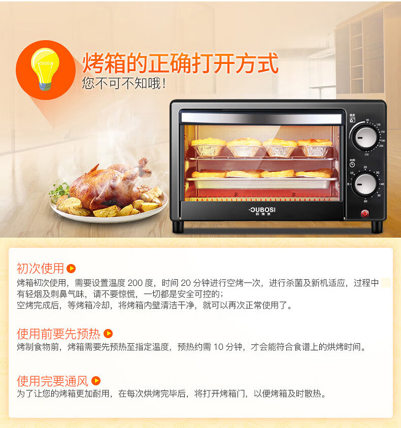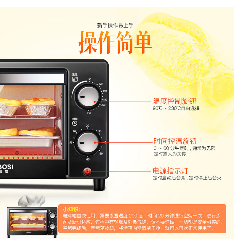• 商品品牌: 欧博思(OUBOSI) • 商品毛重:2.9kg • 商品产地:中国大陆 • 操控方式:手动机械 • 商品类别:烤箱 • 加热管数量:4-6根 • 外观式样:立式 • 适用人数:3-5人 • 配件功能:双层密封玻璃 • 内胆材质:不锈钢 • 温控方式:上下一体调温