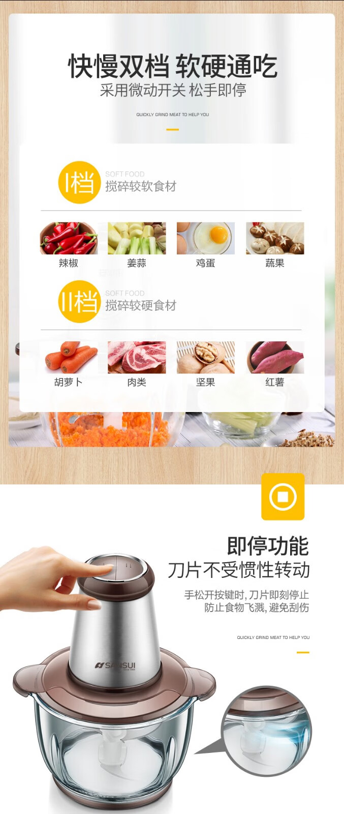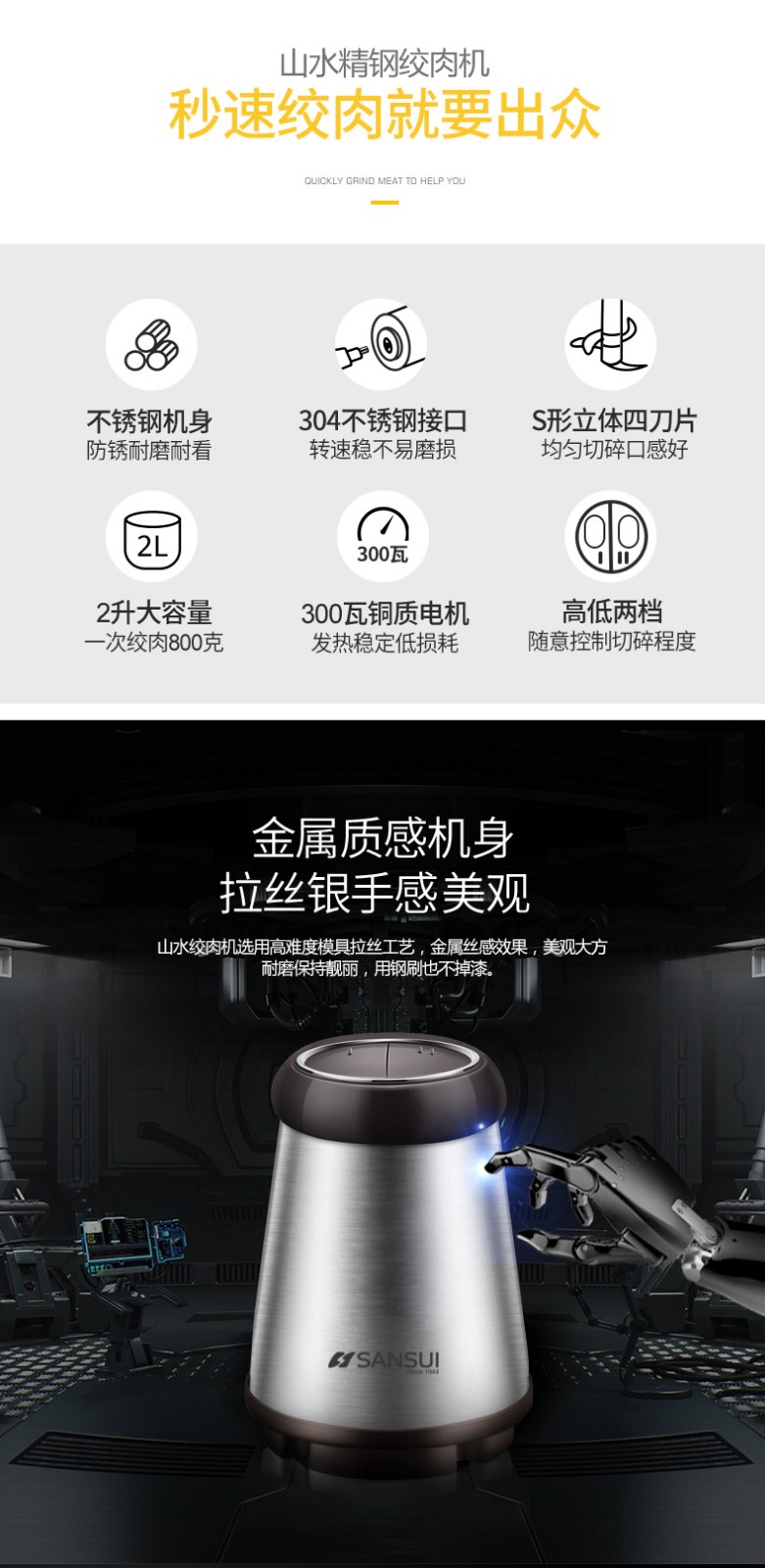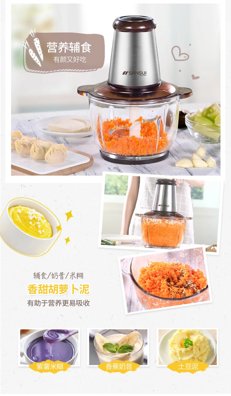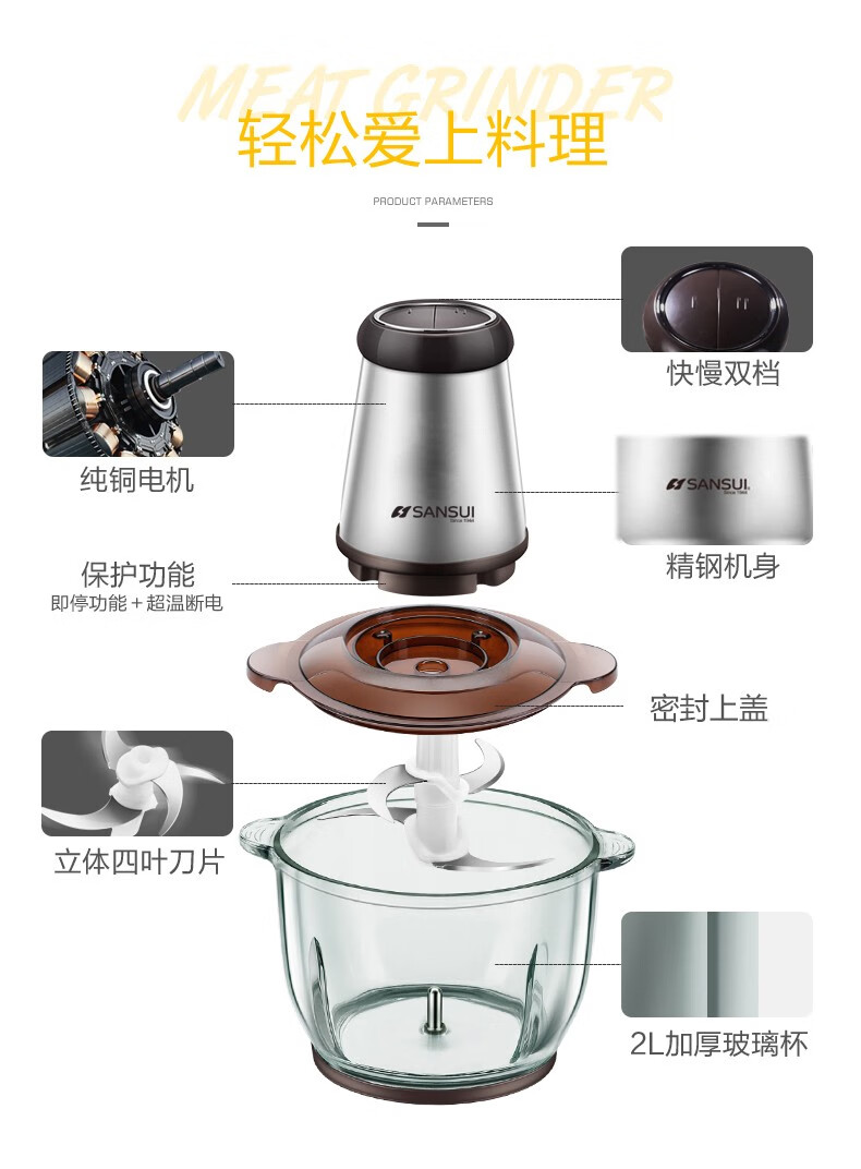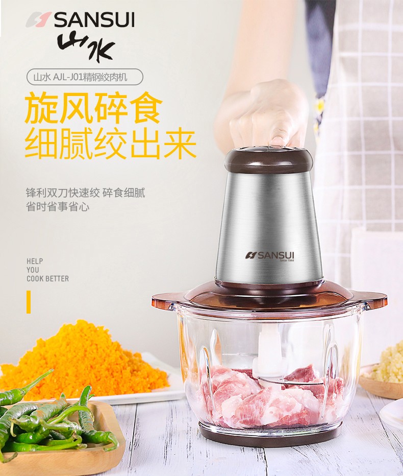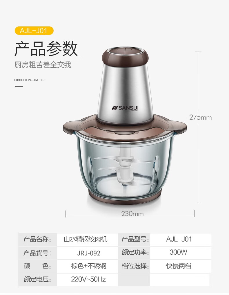 • 商品品牌: 山水(SANSUI) • 商品毛重:2.5kg • 商品产地:中国大陆 • 商品型号:JRJ-092 • 商品容量:1-2升 • 商品功率:300-499W • 机身材料:不锈钢材质 • 商品用途:绞肉