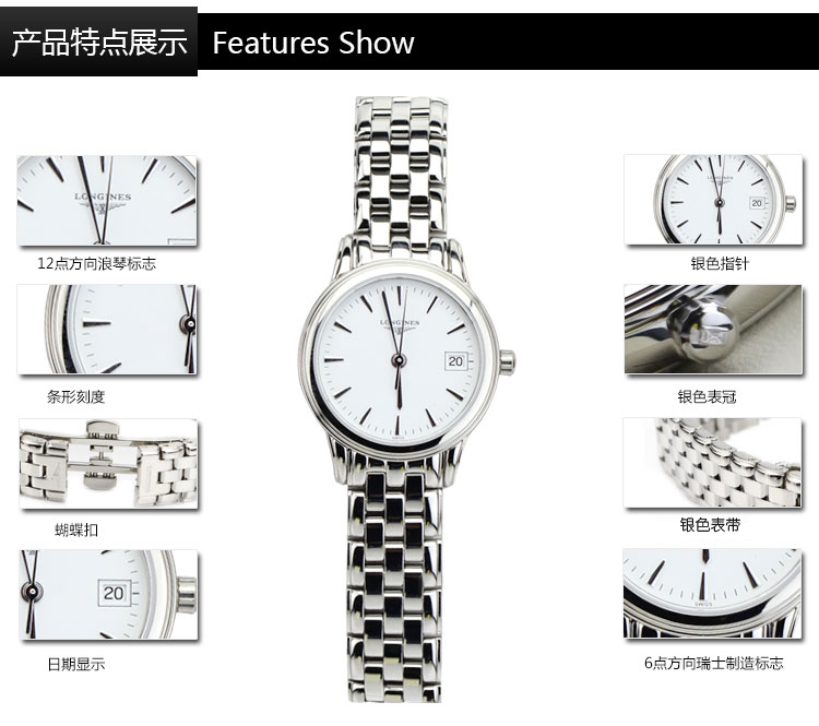 • Model Series : L4.216.4.12.6 • Case Shape : Round • Case Dimensions : 25mm • Case Thickness : 5.70mm • Case Material : Stainless Steel • Dial Colour : White • Glass : Scratch -resistant Sapphire Crystal • Water Resistance : Water-resistant to 3 Bar • Material : Stainless Steel • Buckle : With Triple Safety Folding Clasp And Push-piece Opening Mechanism • Movement Type : Quartz • Hour Markers : White Dial with Index • Functions : Hours, Minutes, Seconds And Date