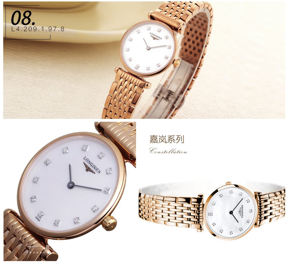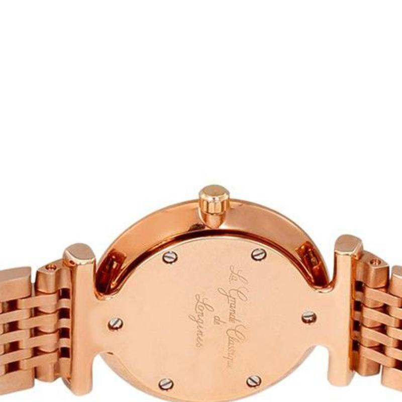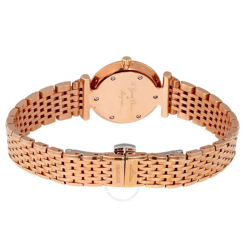 • Series model :L4-209-1-97-8 • Shape : Round • Material : Red PVD Coating • Glass : Scratch-resistant Sapphire Crystal • Water Resistance : Water-resistant to 3 Bar • Colour : White Mother-of-pearl • Hour Markers : Diamond Indexes • Hands : Black Hands • Movement Type : Quartz • Functions : Hours and Minutes • Buckle : With Triple Safety Folding Clasp And Push-piece Opening Mechanism
