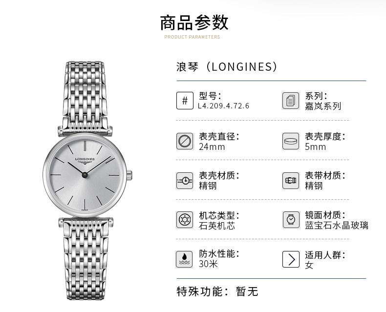 • Series model :L4-209-4-72-6 • Shape : Round • Material : Stainless Steel • Glass : Scratch-resistant Sapphire Crystal • Water Resistance : Water-resistant to 3 Bar • Colour : Sunray Silver • Hour Markers : Painted Indexes • Hands : Black Hands • Movement Type : Quartz • Functions : Hours and Minutes • Buckle : With Triple Safety Folding Clasp And Push-piece Opening Mechanism
