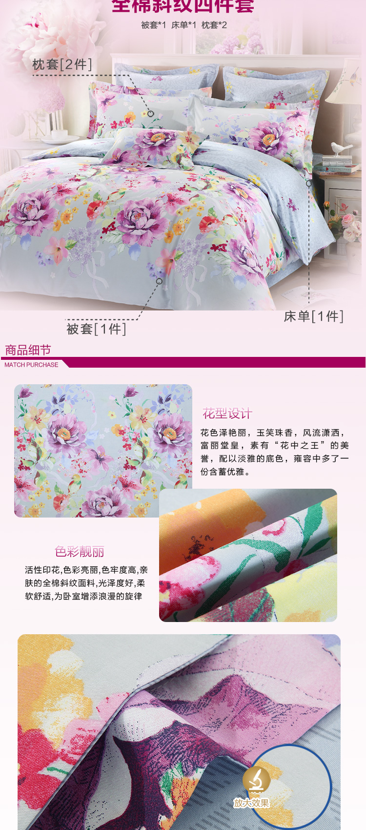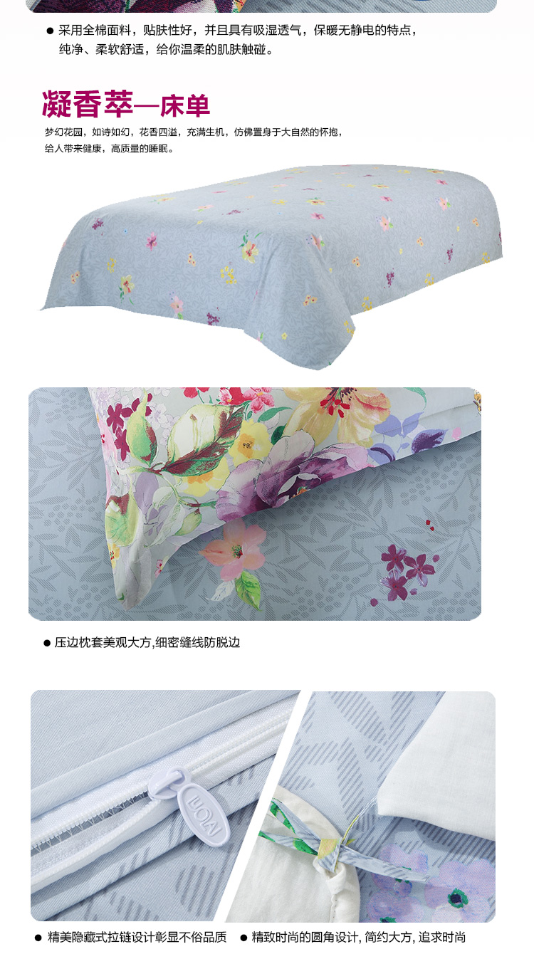 · 商品品牌:罗莱家纺 LUOLAI · 商品毛重:3.0kg · 商品产地:中国大陆 · 面料支数:40支 · 适用季节:春秋 · 商品面料:棉 · 印花工艺:其它 · 适用场景:居家 · 商品风格:简约 · 织造工艺:斜纹 · 商品图案:植物花卉 · 商品款式:床单式 **备注:新老包装混发