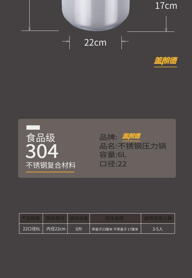 • 商品型号:LTP-DSS2260 • 商品材质:不锈钢 • 商品容量:6L • 商品直径:22cm • 适用炉灶:燃气灶 • 锅底类型:单底
