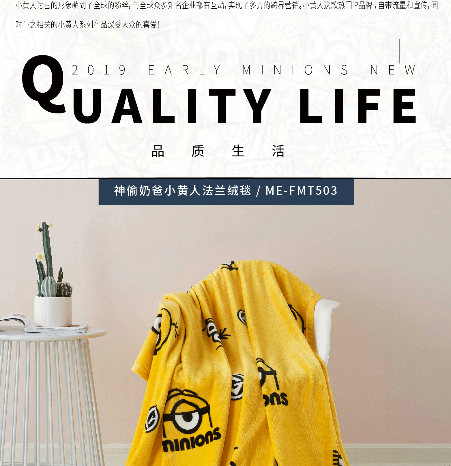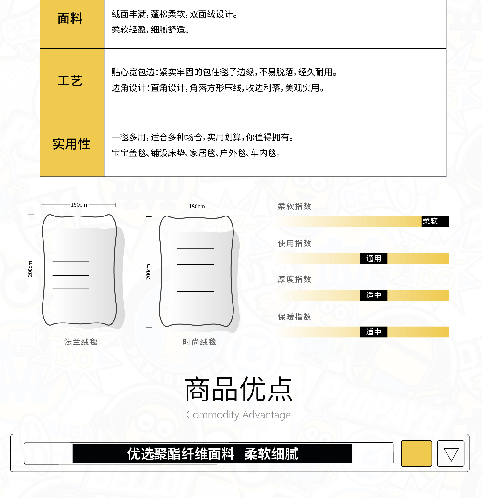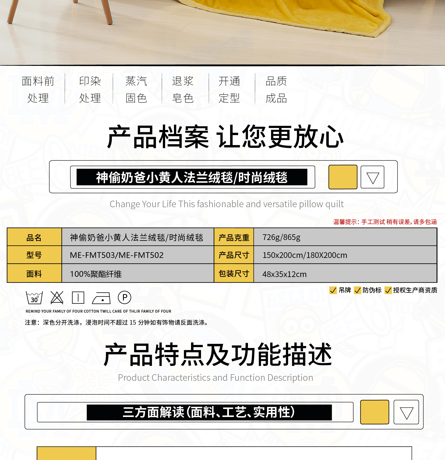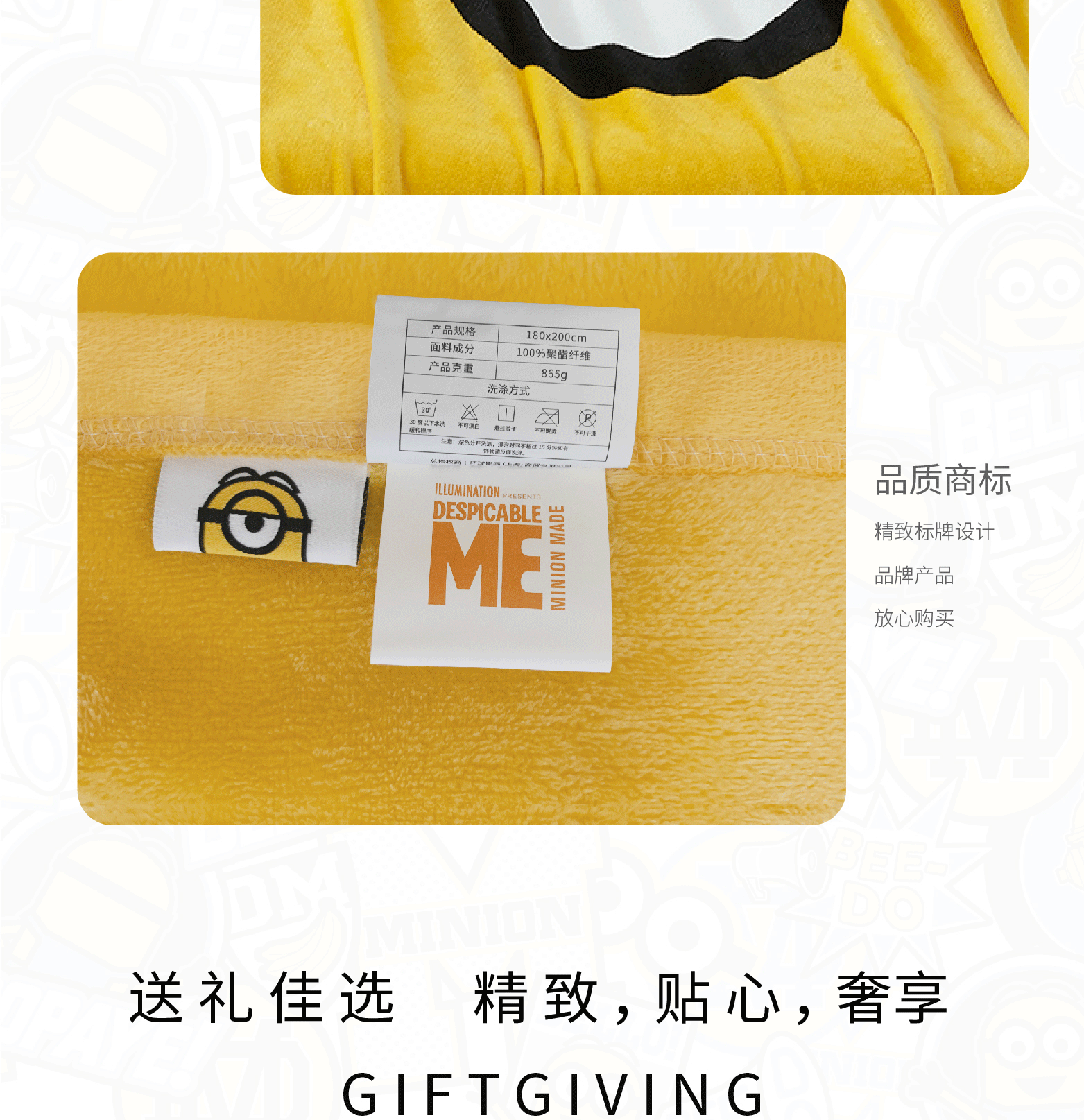 • 商品品牌:小黄人(DESPICABLE ME MINION MADE) • 商品型号:ME-FMT503 • 商品毛重:0.726kg • 适用季节:四季 • 商品类别:法兰绒毯 • 商品尺寸:150*(200-220)cm