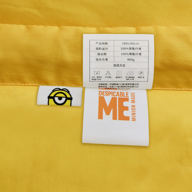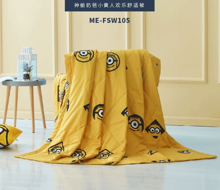 • 商品品牌:小黄人(DESPICABLE ME MINION MADE) • 商品型号:ME-FSW105 • 商品毛重:400.00g • 被套织造工艺:斜纹 • 商品面料:聚酯纤维 • 商品重量:1斤以内 • 商品尺寸:150*200cm • 填充物净重:0.5kg(不含)以内 • 适用季节:四季