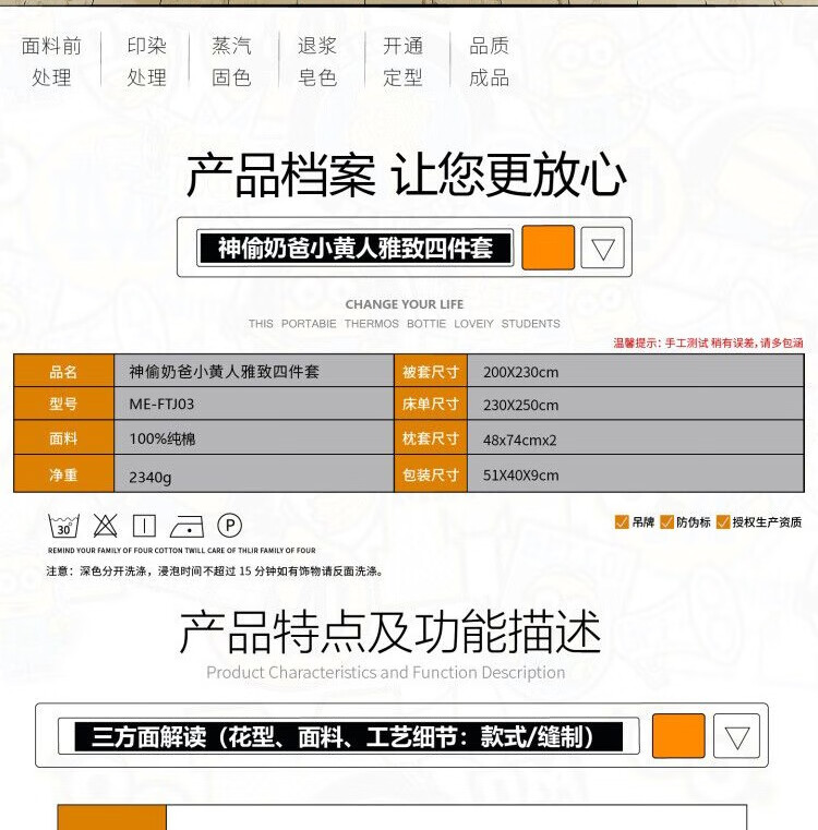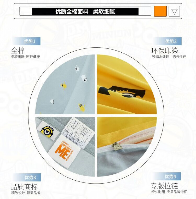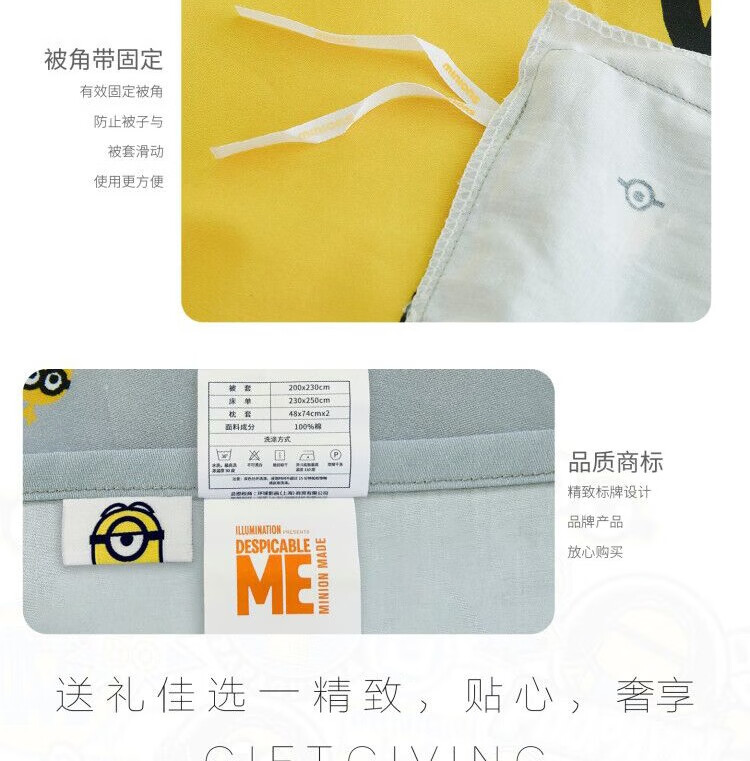 • 商品品牌:小黄人(DESPICABLE ME MINION MADE) • 商品型号:ME-FTJ03 • 商品毛重:2.34kg • 商品面料:棉 • 印花工艺:涂料印花 • 商品款式:床单式 • 商品风格:卡通风 • 适用季节:四季 • 面料支数:40支 • 适用场景:居家