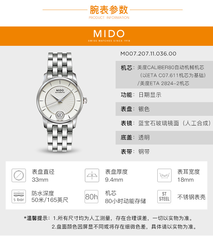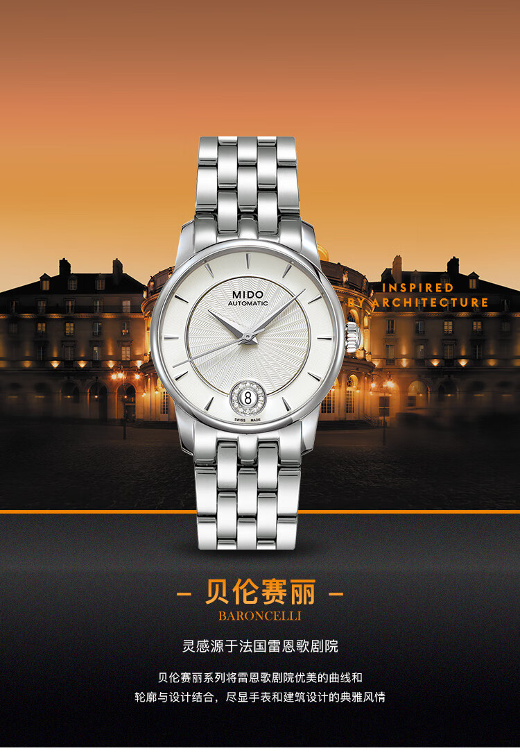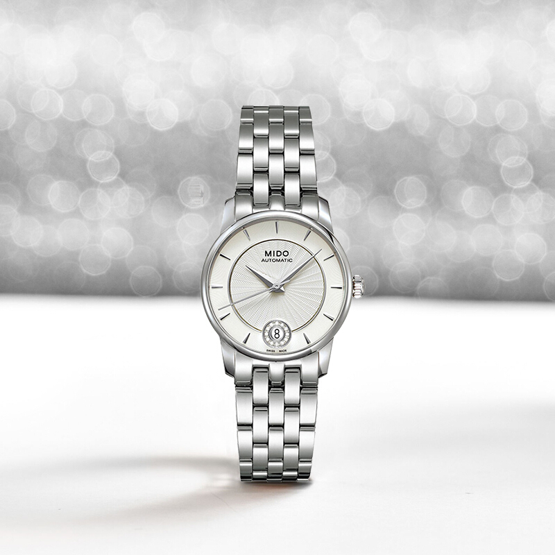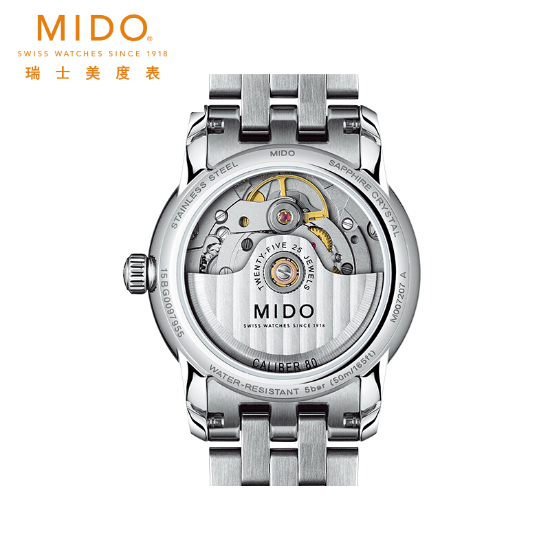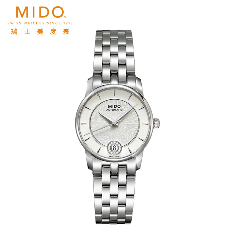 ·手表品牌: 美度(MIDO) ·手表系列:Baroncelli 贝伦赛丽 ·手表型号:M007.207.11.036.00 ·手表毛重:0.804kg ·手表产地:瑞士 ·手表表扣:蝴蝶扣 ·手表表带:不锈钢 ·手表表盘:圆形 ·手表机芯:自动机械 ·适用人群:女士 ·防水等级:50米