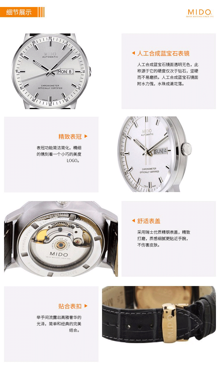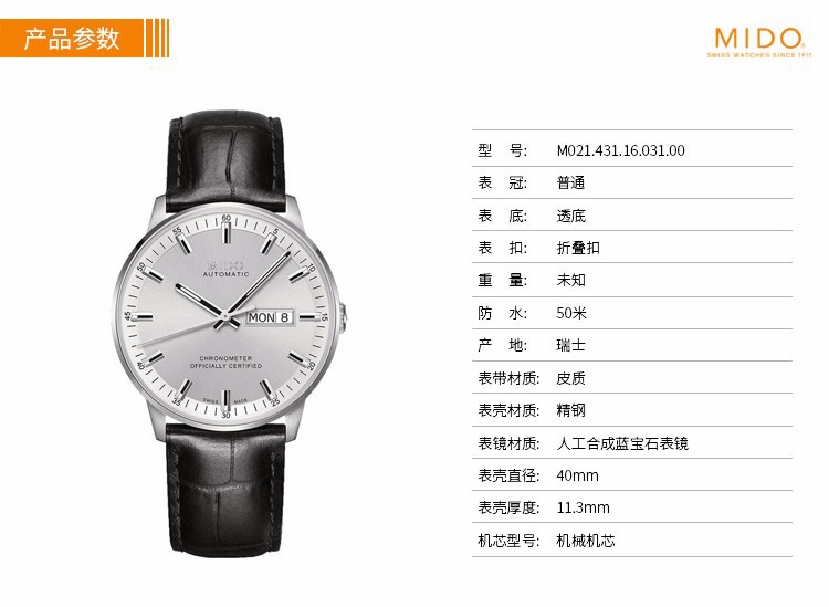 ·手表品牌: 美度(MIDO) ·手表型号:M021.431.16.031.00 ·手表毛重:1.2kg ·手表表扣:折叠扣 ·手表表带:牛皮 ·手表功能:日期显示 ·手表机芯:自动机械 ·适用人群:男士 ·防水等级:50米 ·手表表底:透底 ·手表表壳:精钢 ·手表风格:商务