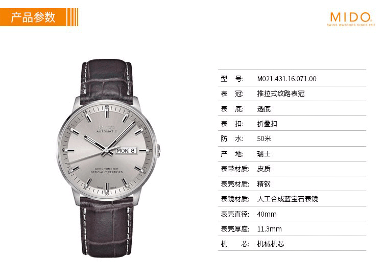 • 手表品牌:美度(MIDO) • 手表型号:M021.431.16.071.00 • 手表系列:COMMANDER指挥官 • 手表毛重:1.0kg • 手表功能:日期显示 • 手表机芯:自动机械 • 适用人群:男士 • 防水等级:50米 • 手表风格:商务 • 手表表底:透底 • 手表表壳:精钢