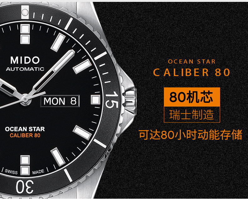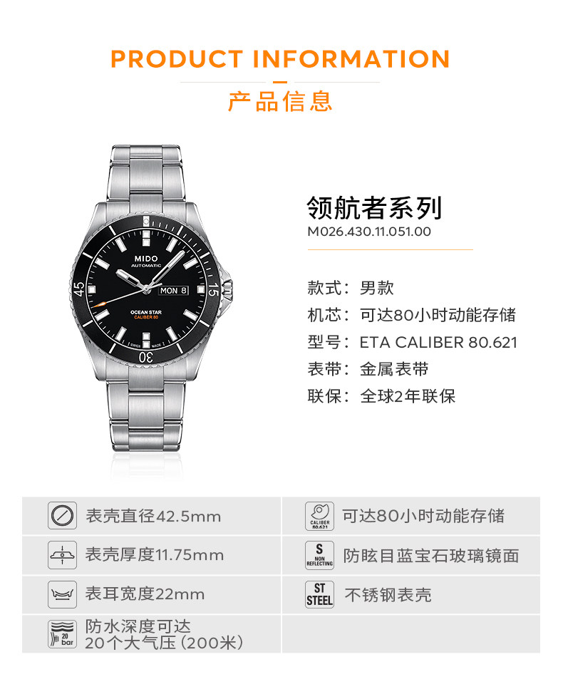• 手表品牌: 美度(MIDO) • 手表型号:M026.430.11.051.00 • 手表系列:OCEAN STAR 领航者 • 手表毛重:1.2kg • 手表产地:瑞士 • 手表表盘:圆形 • 手表机芯:自动机械 • 适用人群:男士 • 防水等级:200米 • 手表表底:不透底 • 手表表壳:精钢