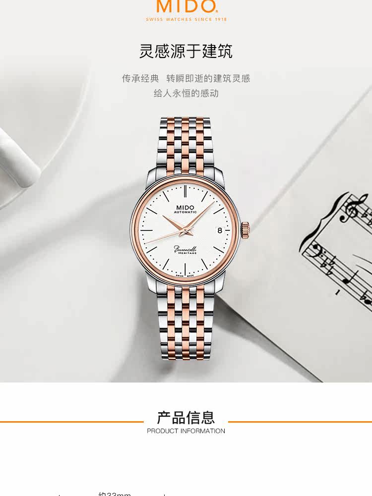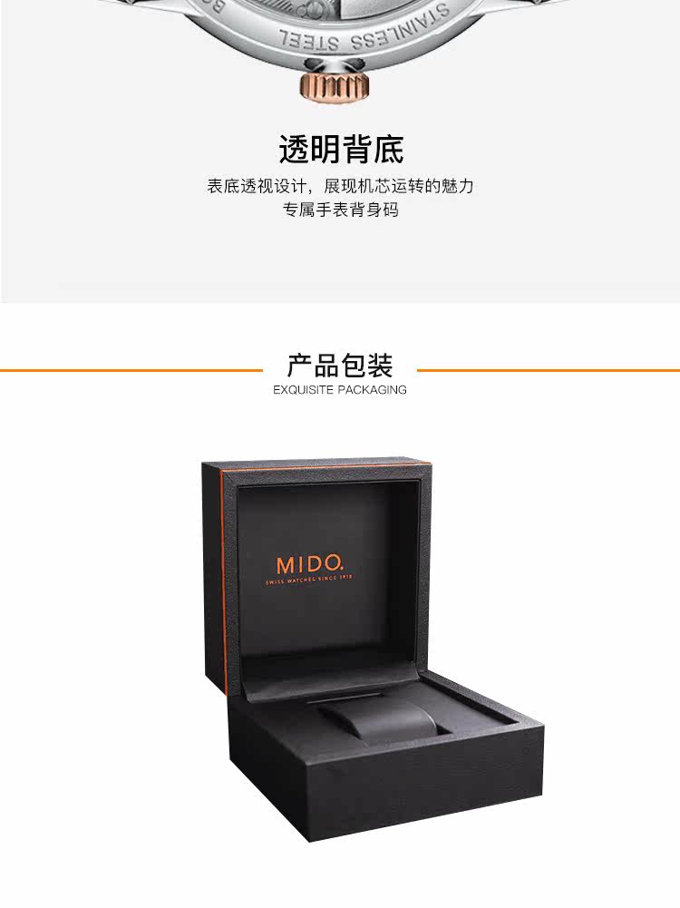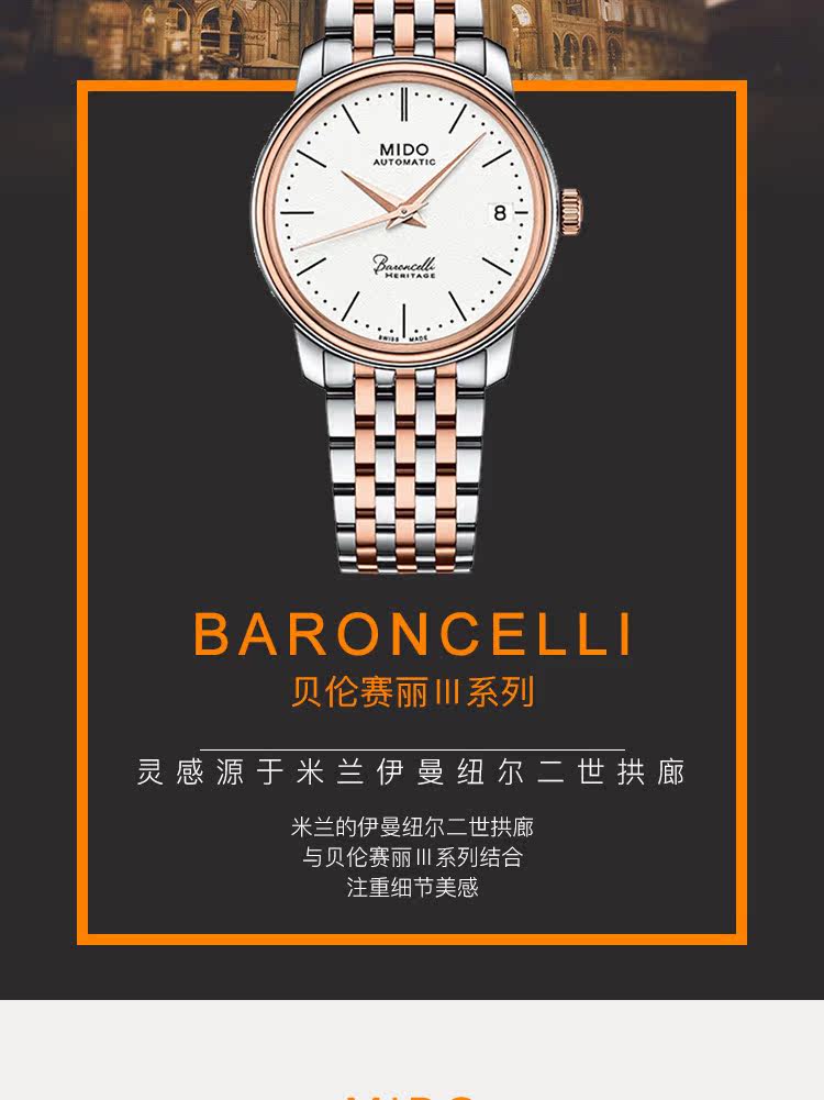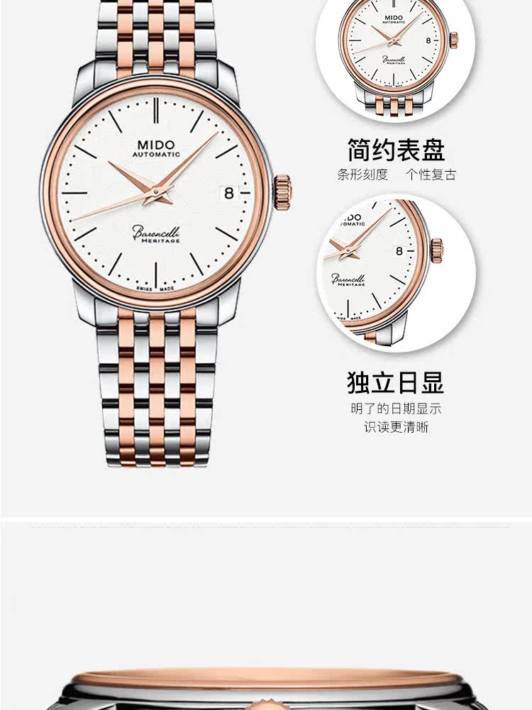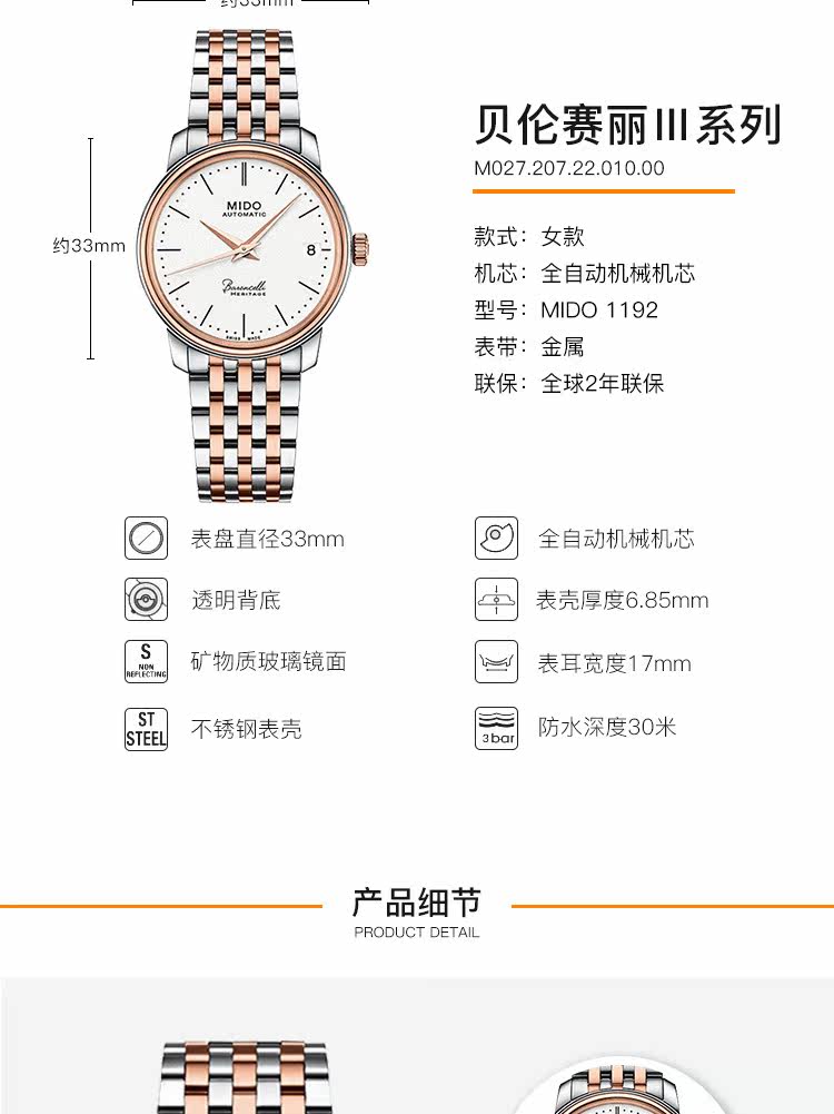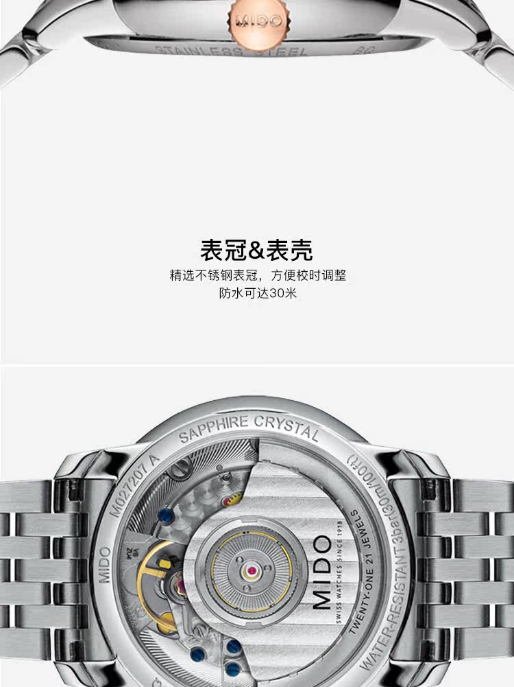 • 手表品牌:美度(MIDO) • 手表型号:M027.207.22.010.00 • 手表系列:Baroncelli 贝伦赛丽 • 手表毛重:1.2kg • 手表产地:瑞士 • 手表表扣:蝴蝶扣 • 手表表带:金属 • 手表表盘:圆形 • 手表功能:日期显示 • 手表机芯:自动机械 • 适用人群:女士 • 手表风格:时尚 • 防水等级:30米 • 手表表底:透底