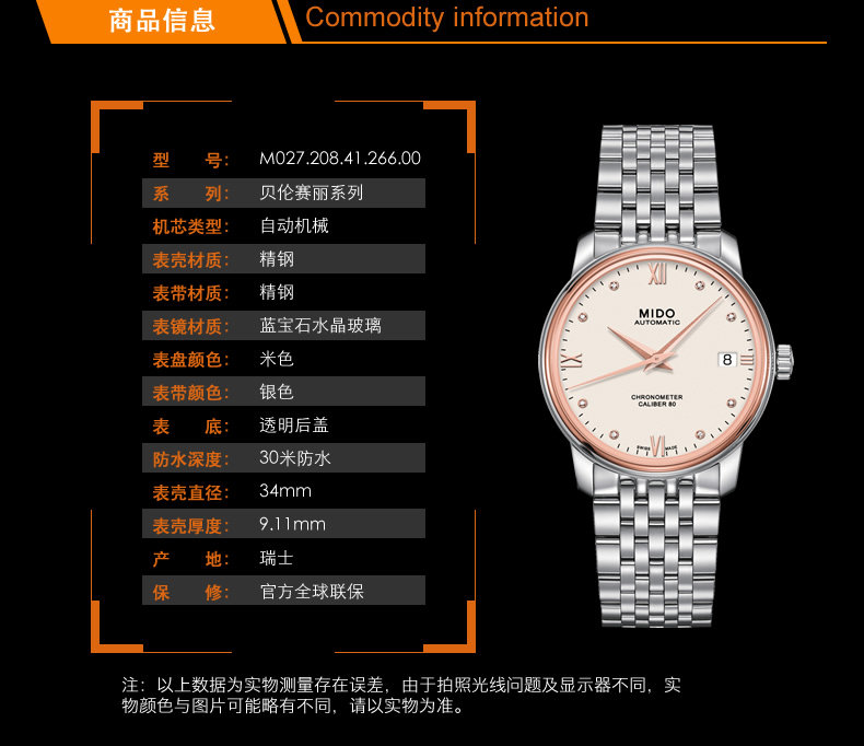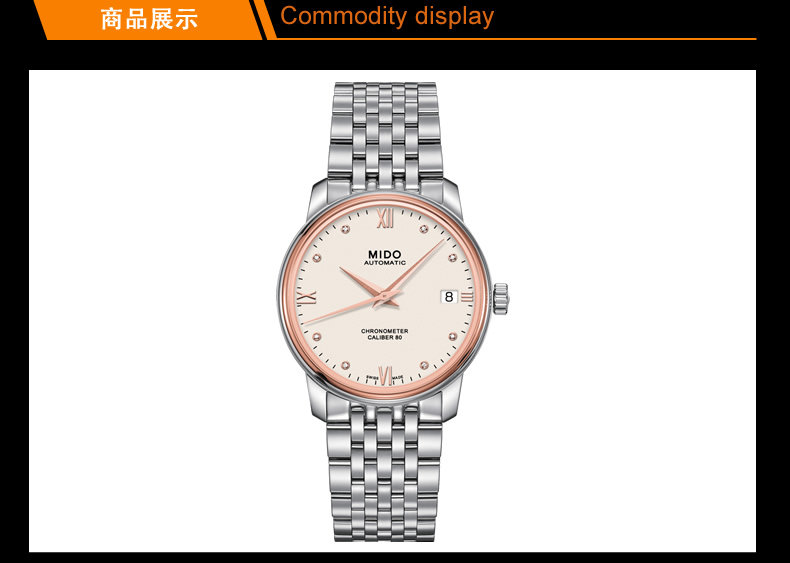 ·手表品牌: 美度(MIDO) ·手表系列:Baroncelli 贝伦赛丽 ·手表型号:M027.208.41.266.00 ·手表种类: 女 ·手表风格: 时尚 ·表带材质: 精钢 ·防水深度: 30米生活防水 ·表壳材质: 精钢 ·手表镜面材质: 人工合成蓝宝石表镜 ·机芯类型: 机械机芯-自动机械机芯 ·品牌产地: 瑞士
