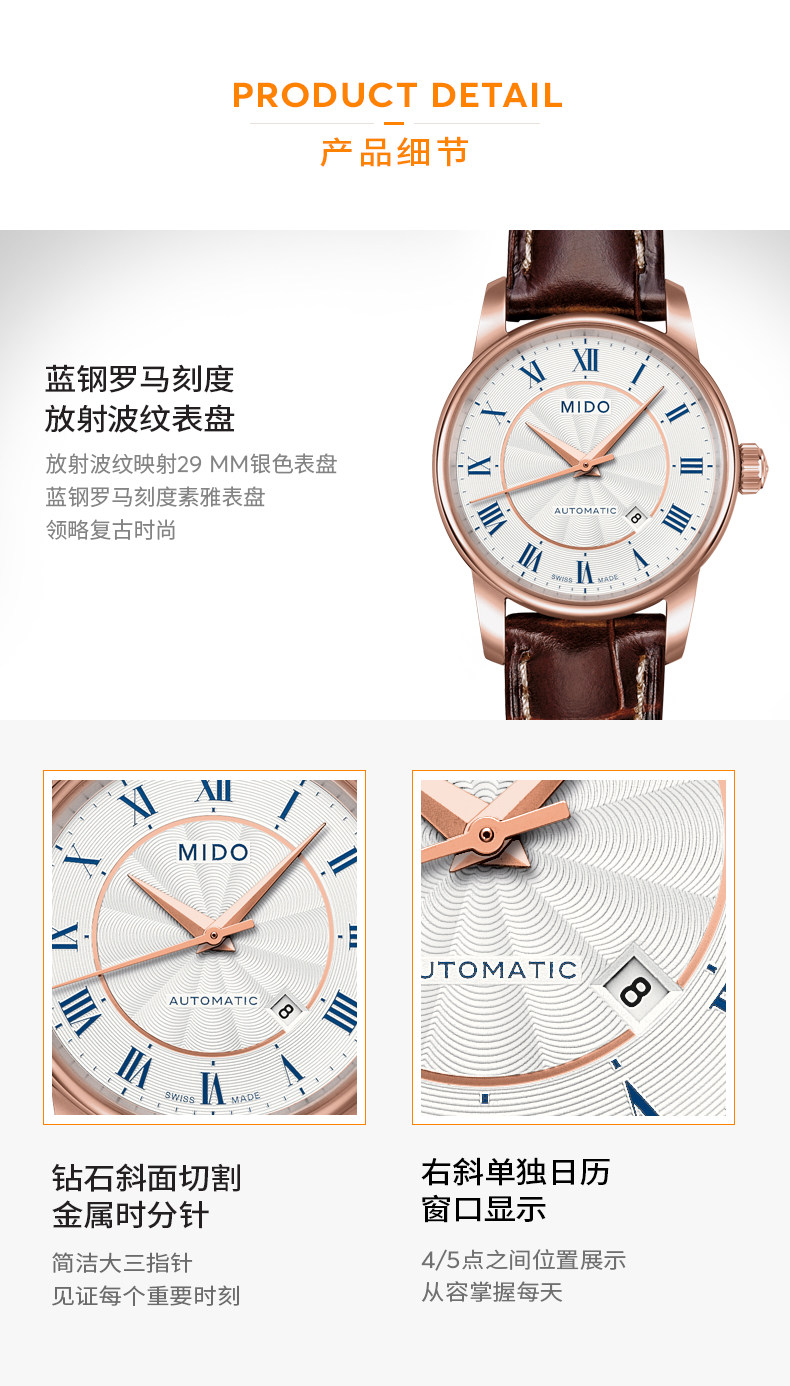 • 手表品牌:美度(MIDO) • 手表型号:M7600.2.21.8 • 手表系列:Baroncelli 贝伦赛丽 • 手表毛重:1.0kg • 手表表扣:折叠扣 • 手表表带:牛皮 • 手表表盘:圆形 • 手表功能:日期显示 • 手表机芯:自动机械 • 适用人群:女士 • 防水等级:50米 • 手表表底:透底 • 手表表壳:精钢 • 手表风格:休闲风,时尚