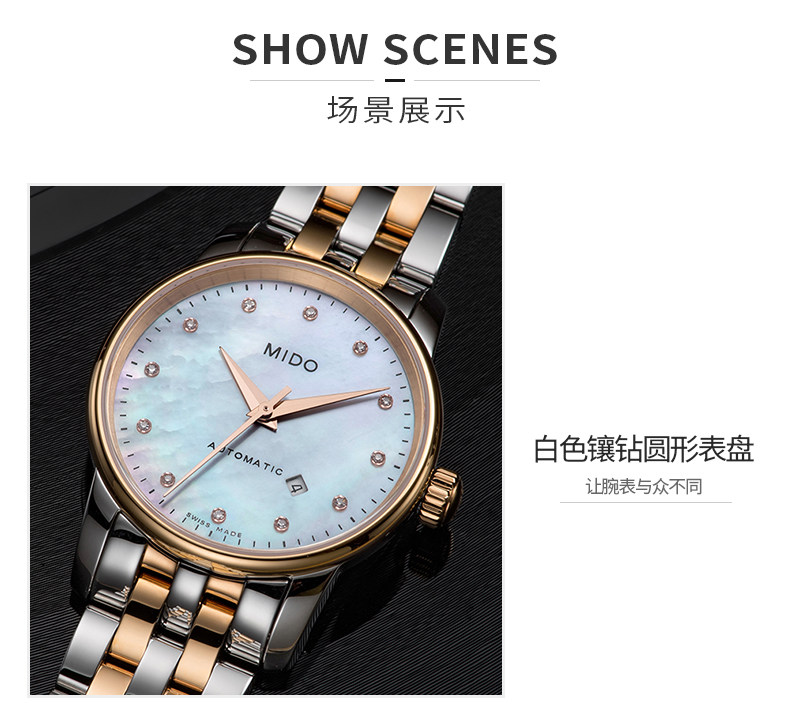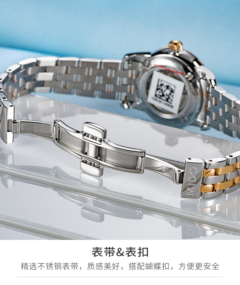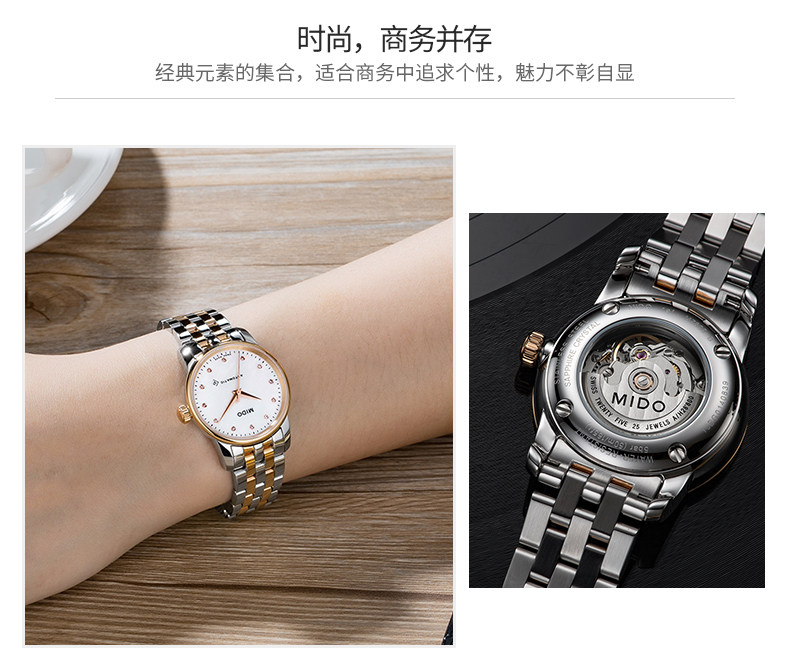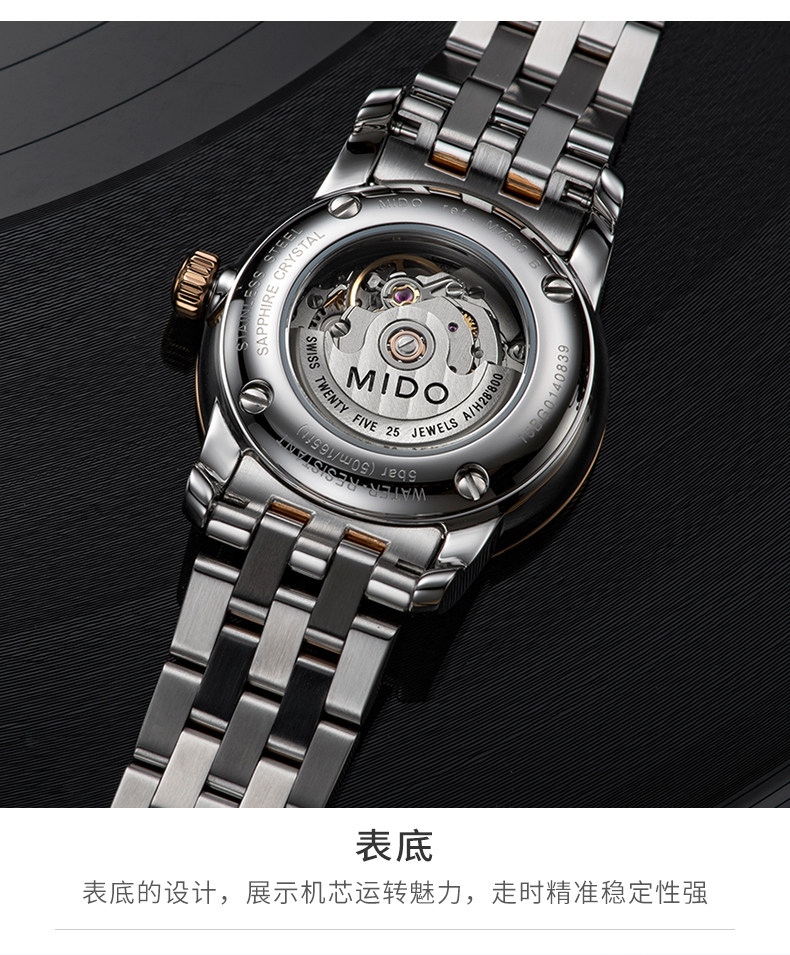 • 手表品牌:美度(MIDO) • 手表型号:M7600.9.69.1 • 手表系列:Baroncelli 贝伦赛丽 • 手表毛重:1.0kg • 手表表扣:蝴蝶扣 • 手表表带:金属 • 手表表盘:圆形 • 手表功能:日期显示 • 手表机芯:自动机械 • 适用人群:女士 • 手表风格:休闲风,时尚 • 防水等级:50米 • 手表表底:透底 • 手表表壳:精钢