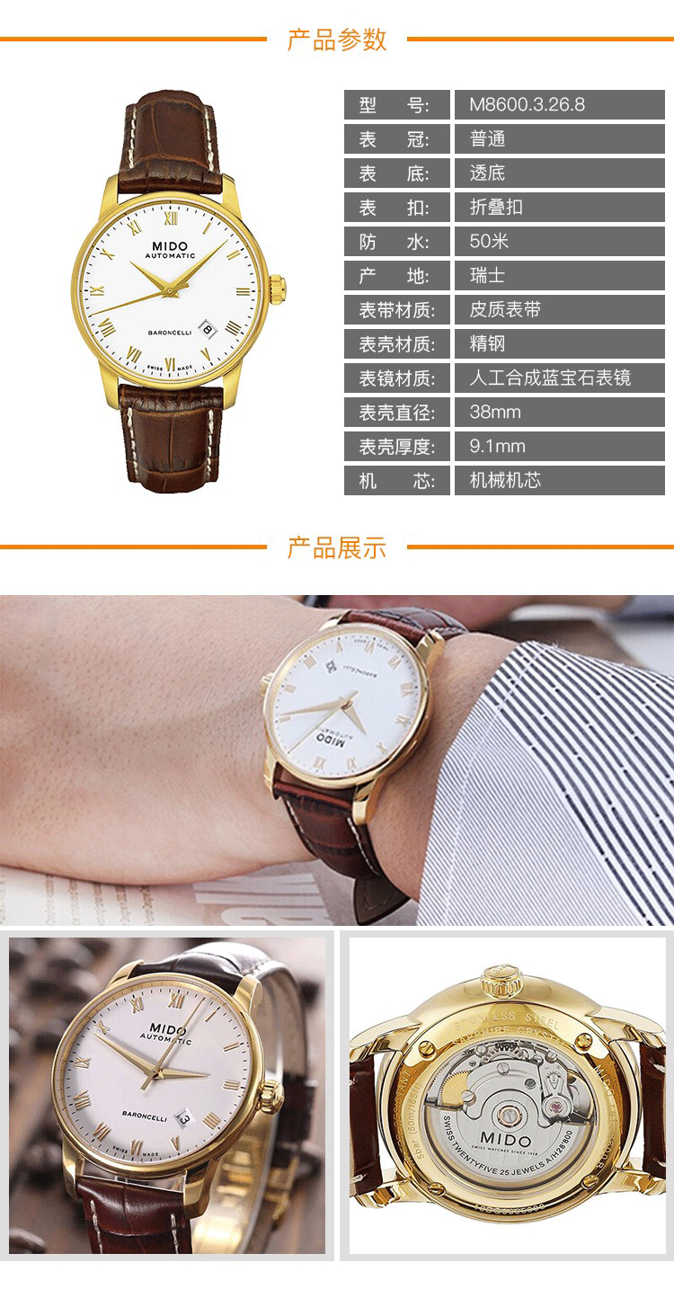 • 手表品牌:美度(MIDO) • 手表型号:M8600.3.26.8 • 手表系列: Baroncelli贝伦赛丽 • 手表毛重:1.0kg • 手表产地:瑞士 • 手表表扣:针扣 • 手表表带:牛皮 • 手表表盘:圆形 • 手表机芯:自动机械 • 适用人群:男士 • 手表风格:时尚,复古风 • 防水等级:30米 • 手表表底:透底
