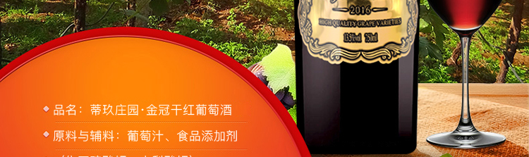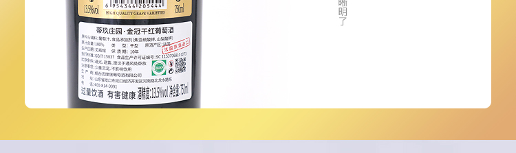 • 商品品牌:蒂玖庄园(DWINEMANOR) • 商品类别:红葡萄酒 • 商品包装:双支 • 酒精度:13.5度 • 单支容量:750 • 葡萄品种:赤霞珠(Cabernet Sauvignon) • 适用人群:18周岁以上成人 • 糖分类型:干型 • 酿造工艺:混合葡萄品种 • 适用场景:婚礼婚宴,礼节拜访,高分低价,女性之选,收藏,冰饮佳品,团圆小
