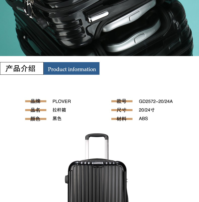 • 箱包品牌:啄木鸟PLOVER • 箱包型号:GD2572-20A • 箱包毛重:2.8kg • 箱包产地:中国大陆 • 拉杆种类:双杆 • 轮子种类:万向轮 • 箱包类别:登机箱 • 锁具类型:普通密码锁 • 闭合方式:拉链 • 箱包尺寸:24英寸 • 是否配包:没有配包 • 箱包材质:ABS&PC • 是否带锁:是 • 适用人群:青少年 • 是否有扩展层:无扩展层 • 适用性别:通用 • 箱包硬度:软硬结合 • 箱包颜色:黑色 • 箱包图案:条纹