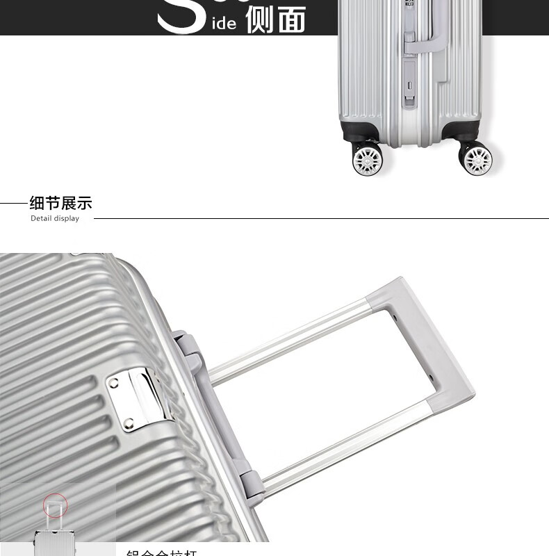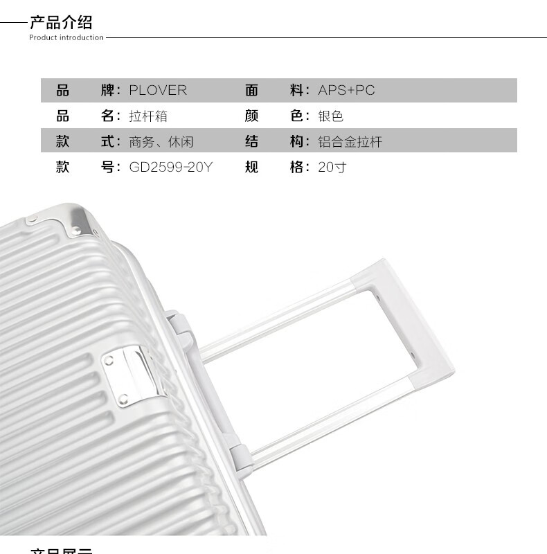 • 箱包品牌: 啄木鸟PLOVER • 箱包型号:GD2599-20Y • 箱包毛重:2.8kg • 箱包产地:中国大陆 • 拉杆种类:双杆 • 轮子种类:万向轮 • 箱包类别:登机箱 • 锁具类型:挂锁 • 闭合方式:卡扣 • 箱包尺寸:20英寸 • 是否配包:没有配包 • 箱包材质:ABS&PC • 是否带锁:是 • 适用人群:青少年 • 是否有扩展层:无扩展层 • 适用性别:通用 • 箱包硬度:硬箱 • 箱包颜色:银色 • 箱包图案:条纹 • 适用场景:出差