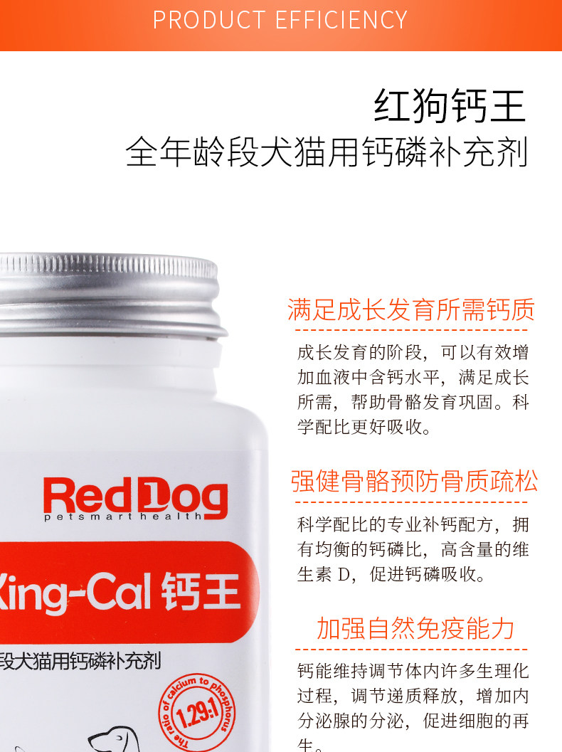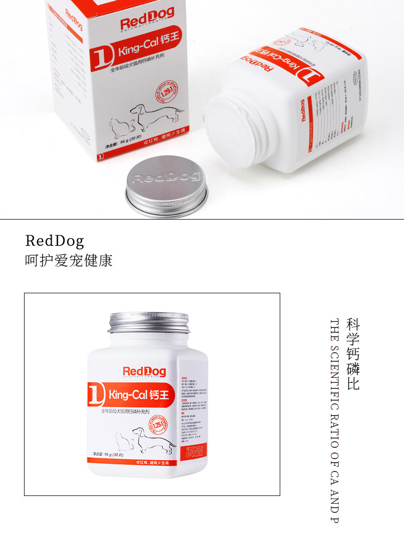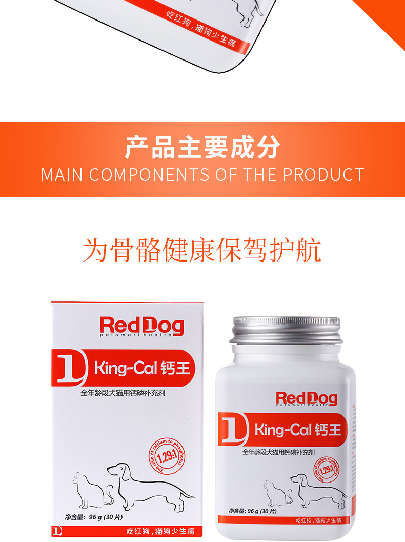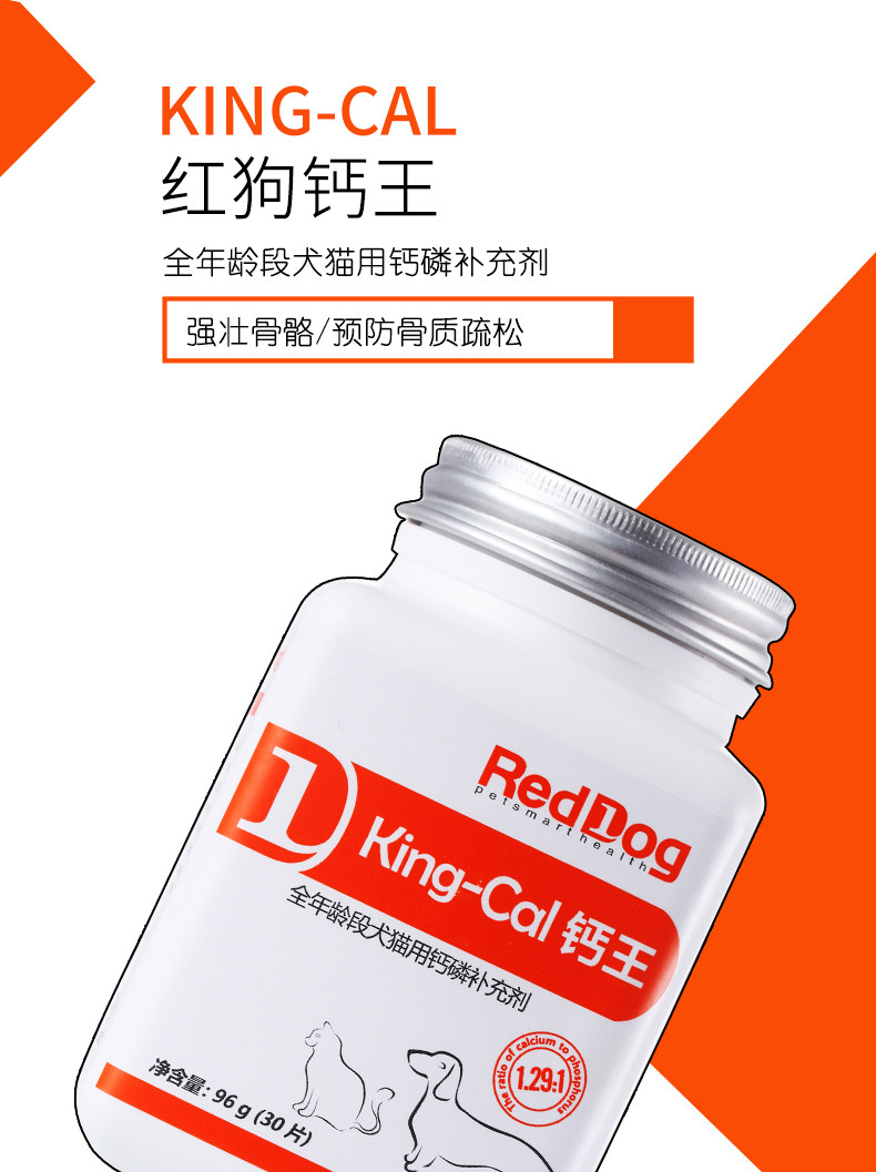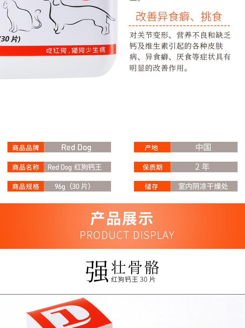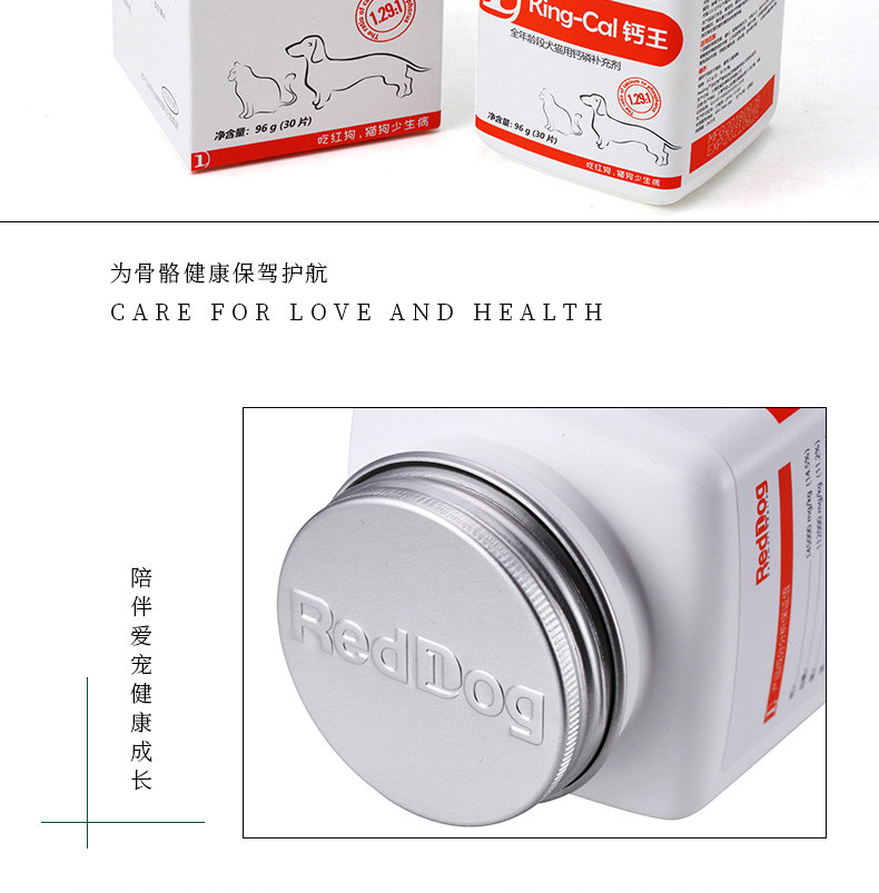 · 商品品牌: 狗REDDOG · 商品规格:96g(30片) · 商品功效: 健骨补钙 · 适用阶段:成长期 · 国产/进口:国产 · 适用对象:狗狗