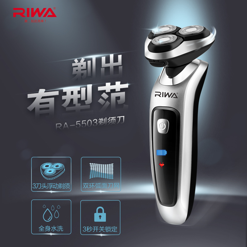 -商品品牌:RIWA雷瓦 -商品型号:RA-5503 -商品类型:旋转式 -刀头数量:3个 -外形设计:灰色 LED显示 -商品重量:460g -其它性能:干剃型, 3刀头浮动剃须, 双环弧面刀网, 3秒开关锁定 -电源类型:充电式