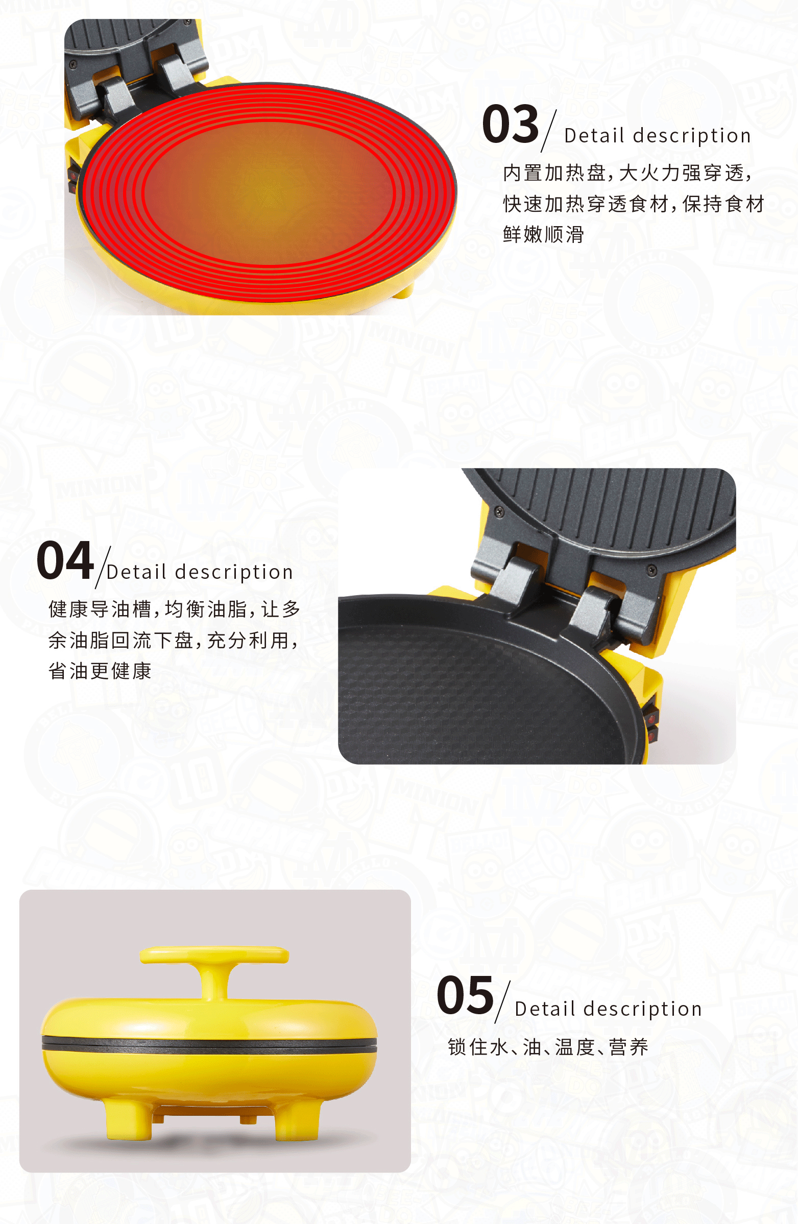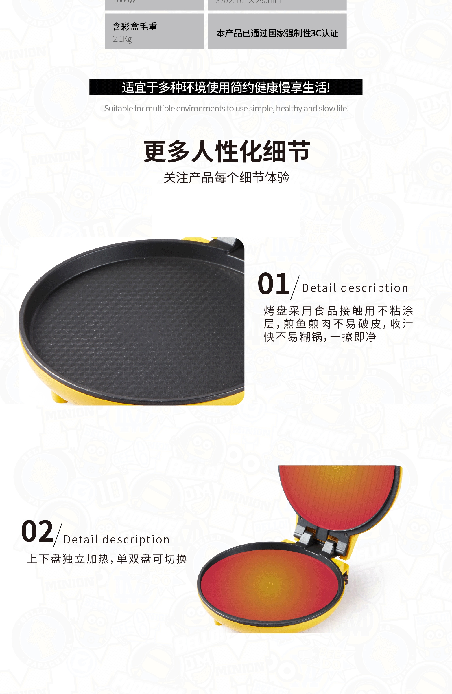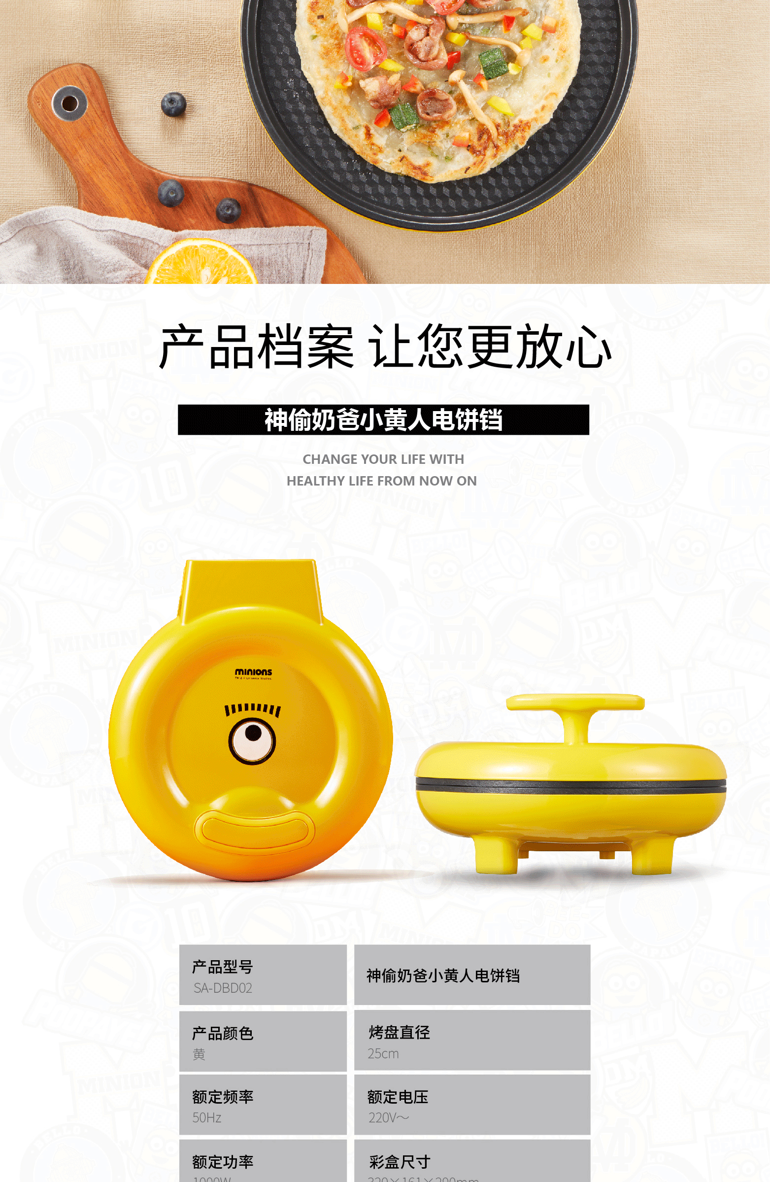 • 商品品牌:小黄人(DESPICABLE ME MINION MADE) • 商品型号: SA-DBD02 • 商品功率: 1000W及以下 • 颜色分类: 黄色 • 电饼铛加热面: 双面加热 • 饼铛类型: 电饼铛 • 电饼铛操作方式: 机械式 • 商品功率: 1000W • 烤盘口径: 25cm • 烤盘深度: 3cm • 采购地: 亚太 • 烙盘拆卸形式: 不可拆 • 烤盘功能: 做鸡蛋仔 烙饼/煎饼