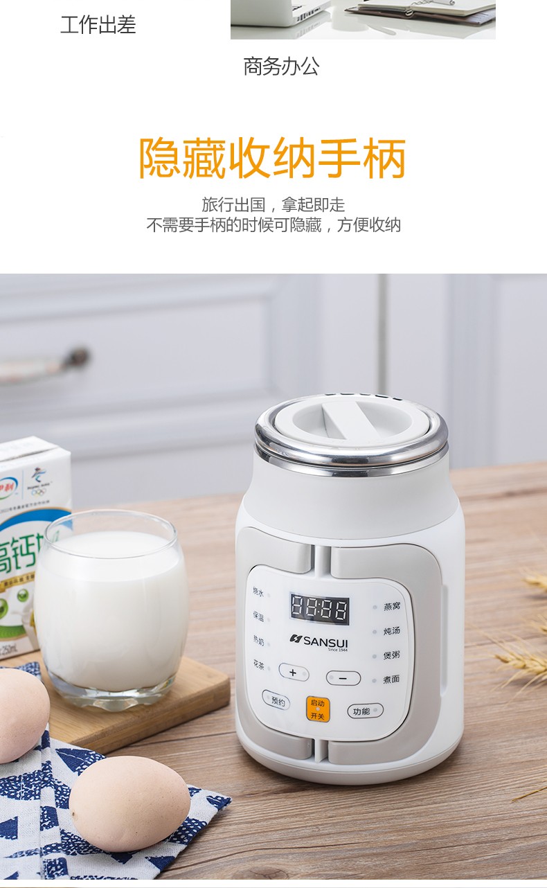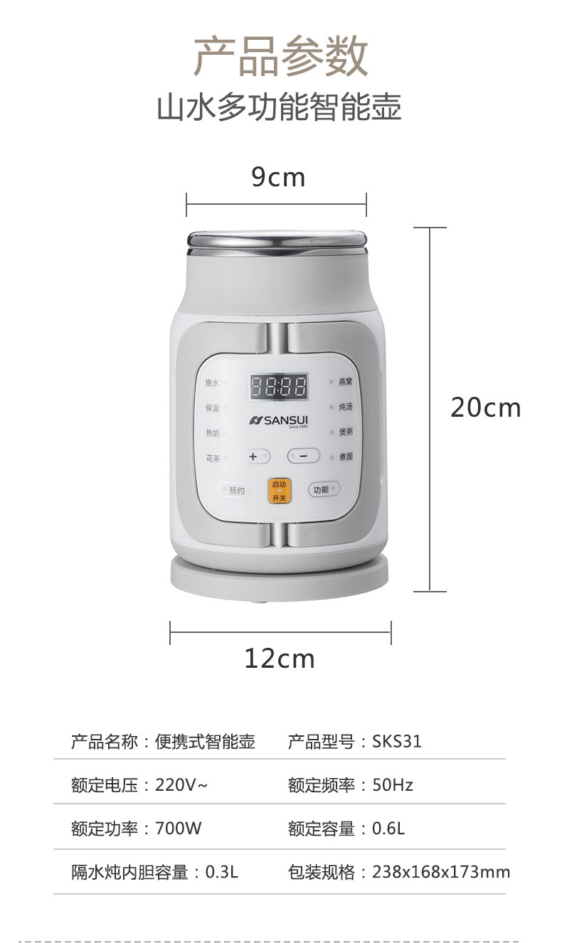 • 商品品牌:山水(SANSUI) • 商品型号:SKS31 • 商品毛重:1.0kg • 商品产地:中国大陆 • 特色功能:保温,防干烧,定时功能 • 商品材质:单层不锈钢 • 商品容量:1L及以下 • 商品类别:电热水壶