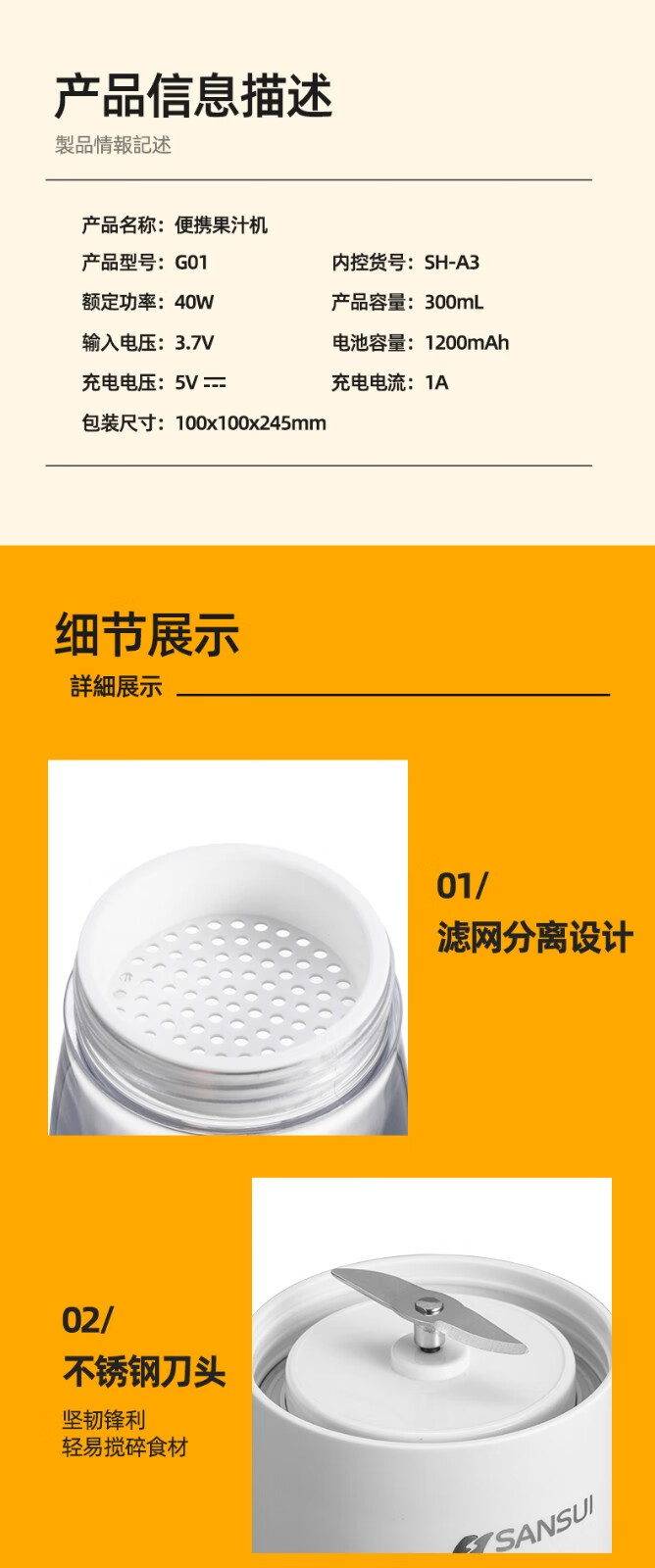 • 商品品牌:山水(SANSUI) • 商品型号: SH-A3 • 商品毛重:0.8kg • 进料口:单口 • 滤网数量:无 • 操作方式:按键式 • 机身材质:其他 • 商品功能:榨汁