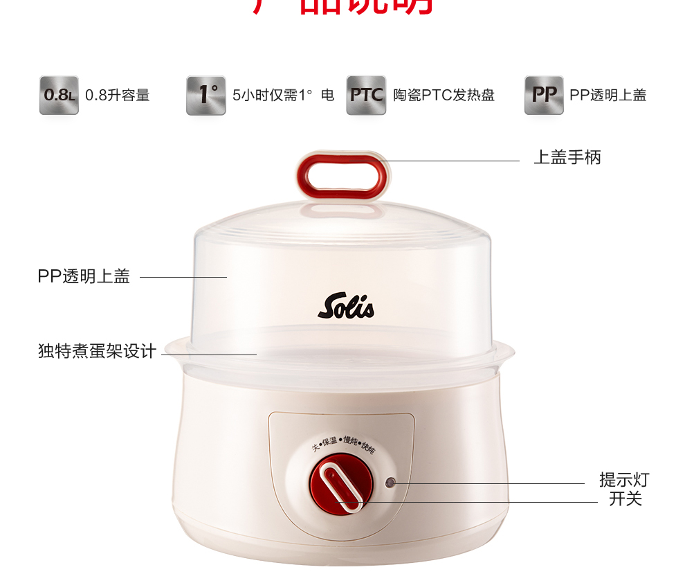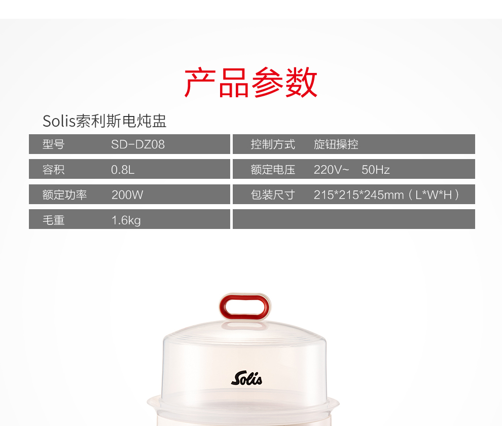 • 商品品牌: 索利斯(SOLIS) • 商品型号: SD-DZ08 • 商品毛重:1.6kg • 操控方式:旋钮式 • 内胆数量:1个