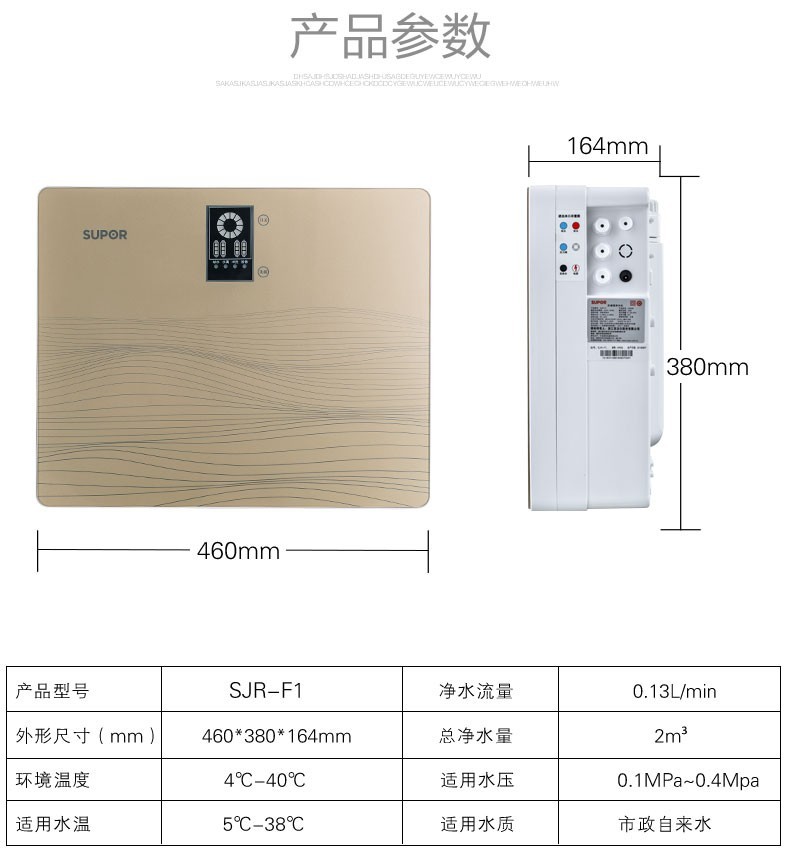 • 商品品牌:SUPOR苏泊尔 • 商品型号:HR506 • 商品毛重:5.0kg • 商品产地:中国大陆 • 商品类别:纯水机 • 适用场景:厨房台下式 • 净水流量:0.13L/min • 外形尺寸:460*380*164mm • 环境温度:4-40C