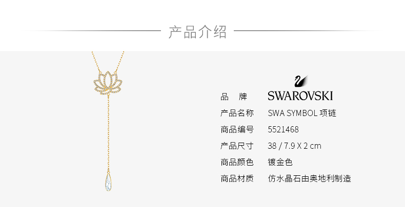 • 链子品牌:Swarovski/施华洛世奇 • 链子型号: 5521468 • 链子材质: 合金/镀银/镀金 • 适用性别: 女 • 是否多层: 否 • 是否带坠: 是