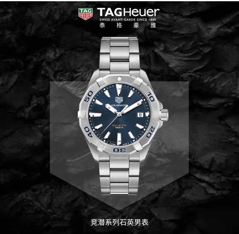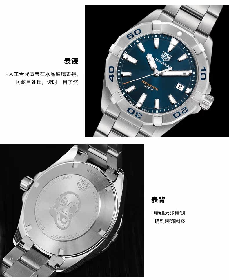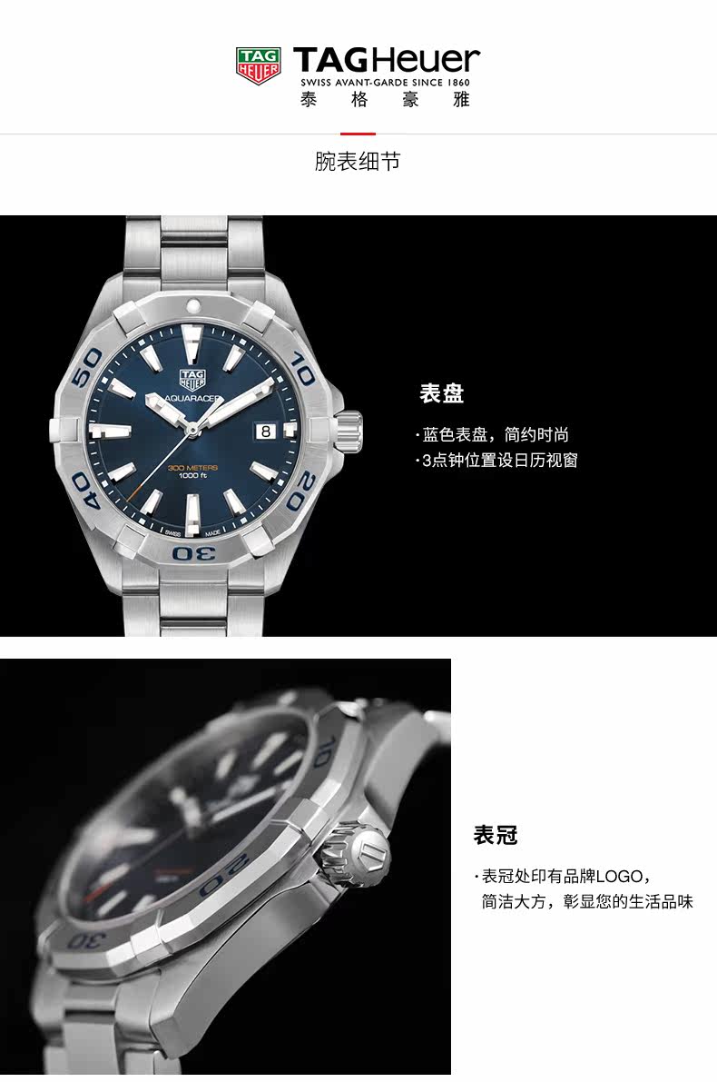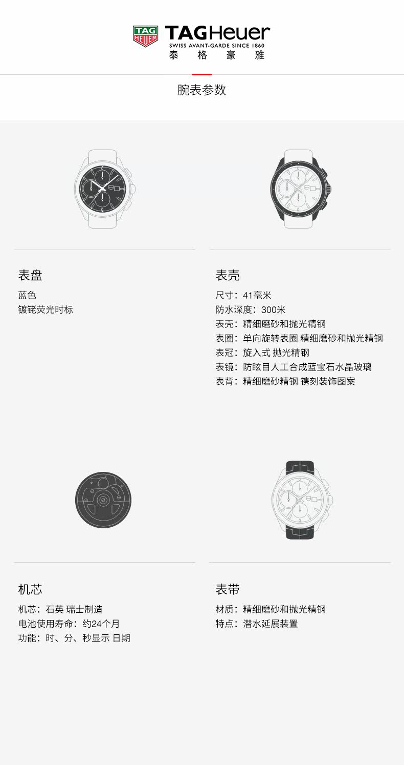·手表品牌: 泰格豪雅(TAGHeuer) ·手表系列: Aquaracer竞潜 ·手表型号:WBD1112.BA0928 ·手表毛重:2.48kg ·手表产地:瑞士 ·手表表扣:折叠扣 ·手表表盘:圆形 ·手表功能:日期显示,计时码表,大三针 ·手表机芯:自动机械 ·适用人群:男士 ·手表表底:不透底 ·手表表壳:精钢 ·防水深度:300米