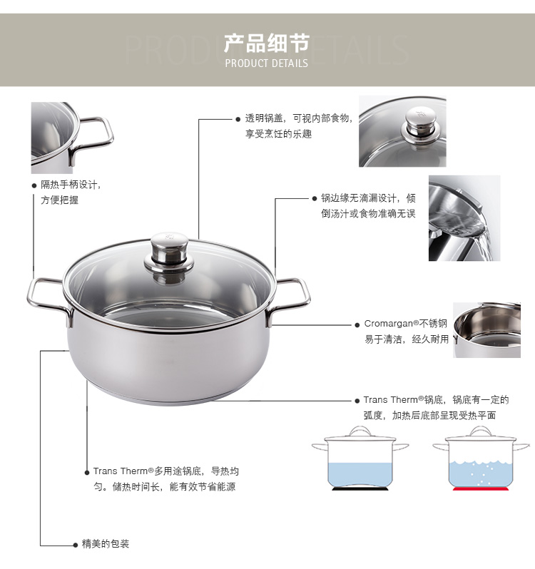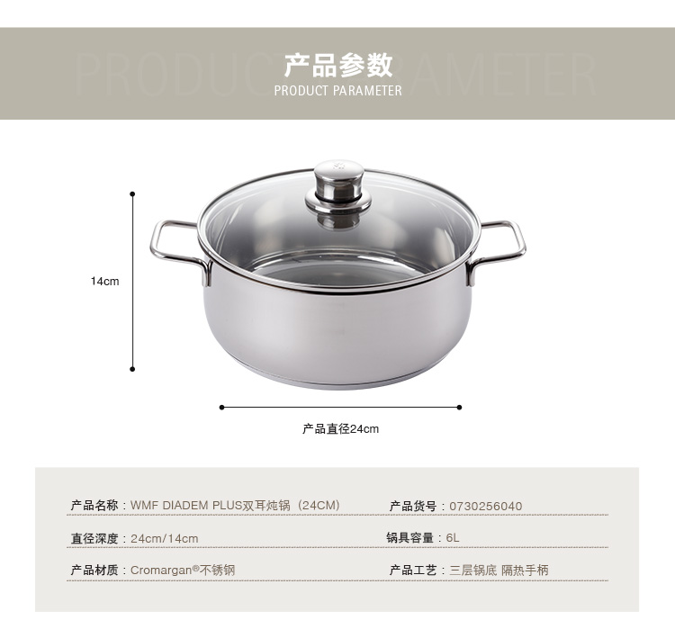 -Brand: WMF -Product gross weight: 1.5kg -Diameter: 22cm -Material: 304 stainless steel -Pot bottom type: compound bottom