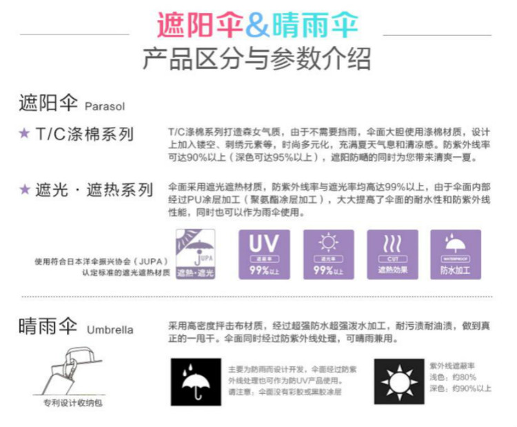 -雨伞毛重:500.00g -雨伞产地:中国大陆 -雨伞类型:三折伞 -打开方式:非自动伞 -伞面涂层:彩胶 -伞面材质:聚酯纤维 -雨伞图案:纯色,条纹