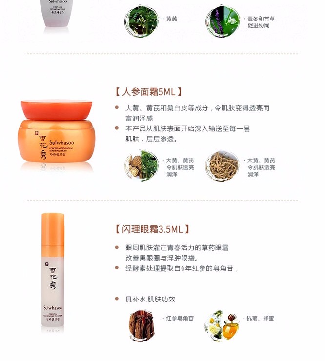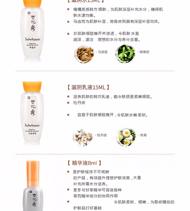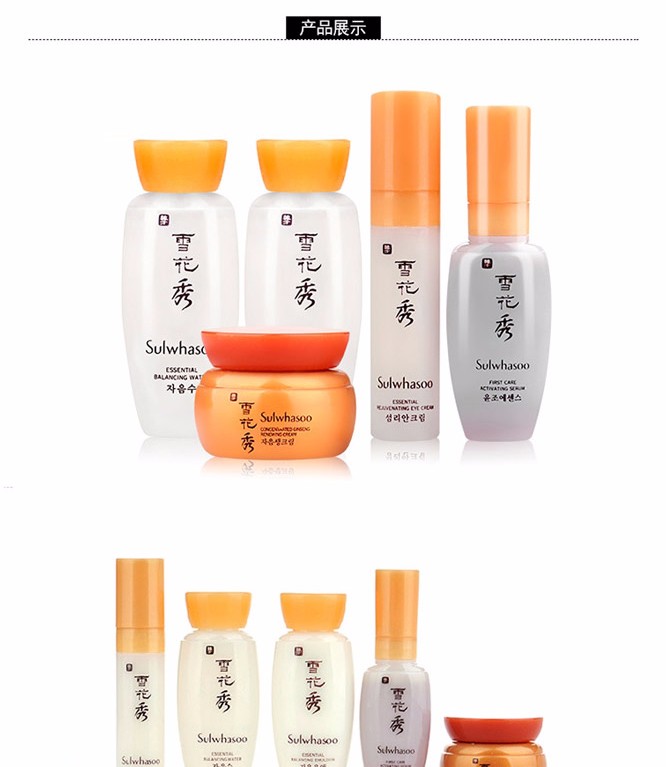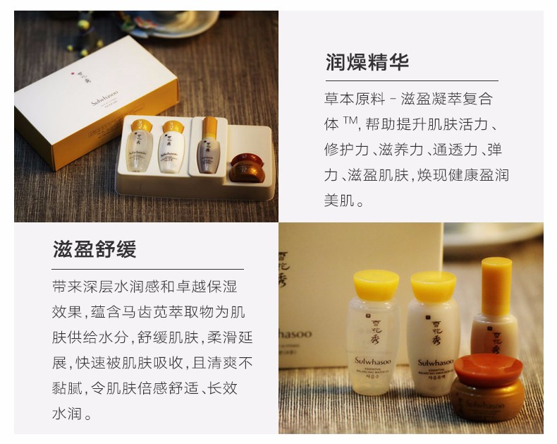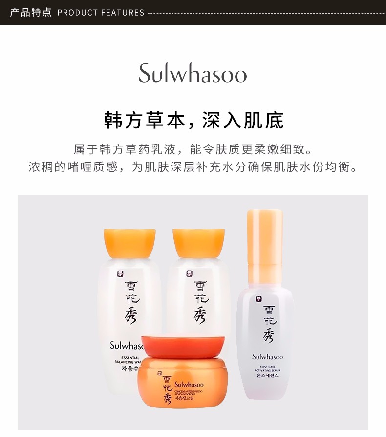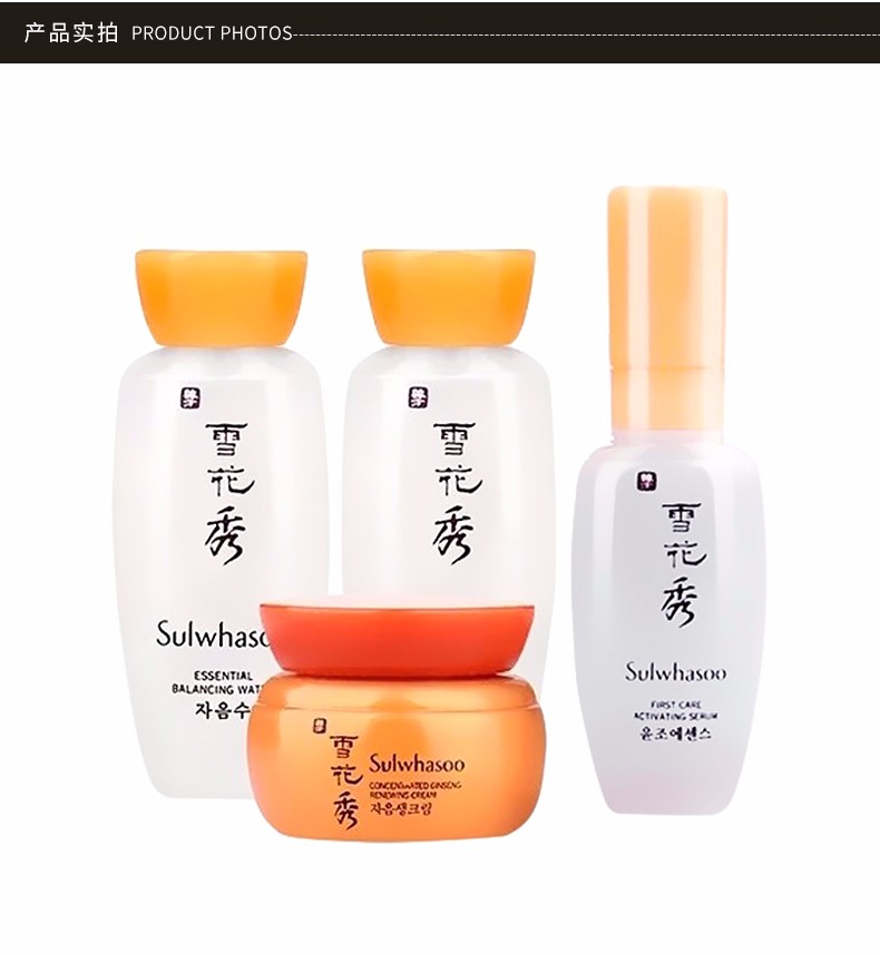· 品牌:雪花秀(Sulwhasoo) · 类别:护理套装 · 国产/进口:进口 · 产地:韩国 · 包装清单:四件套 · 功效:补水,保湿 · 适合肤质:各种肤质 · 适用人群:通用